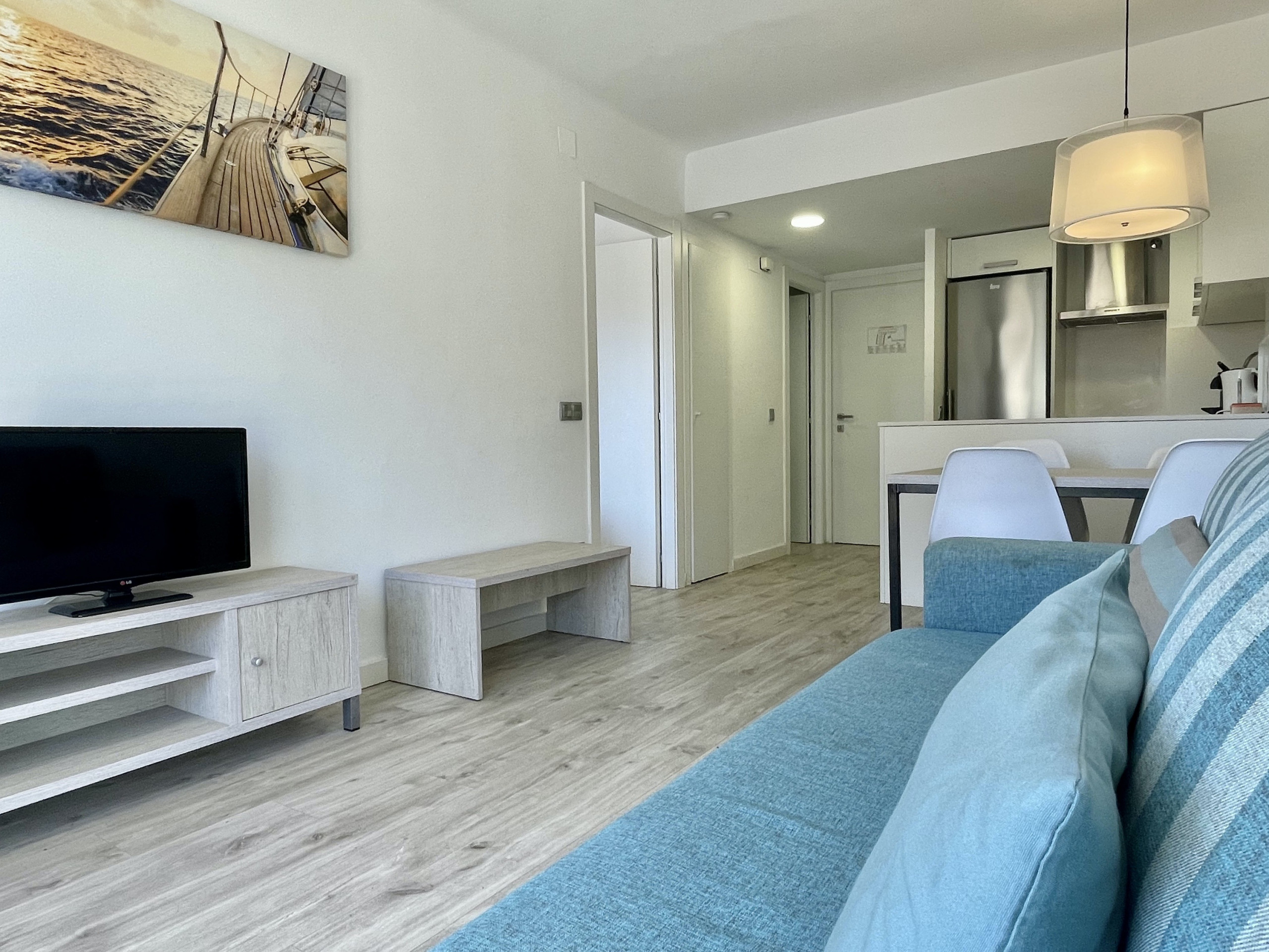In der Anlage Rocamaura steht diese Ein-Zimmer-Wohnung für Ferienvermietung zur Verfügung. Sie verfügt über ein Doppelstockbett und ein Einzelbett und bietet Platz für bis zu 3 Personen. Die Wohnung umfasst ein Wohn-Esszimmer mit Sofa und Fernseher, eine kleine separate Küche und ein Badezimmer mit Dusche.
