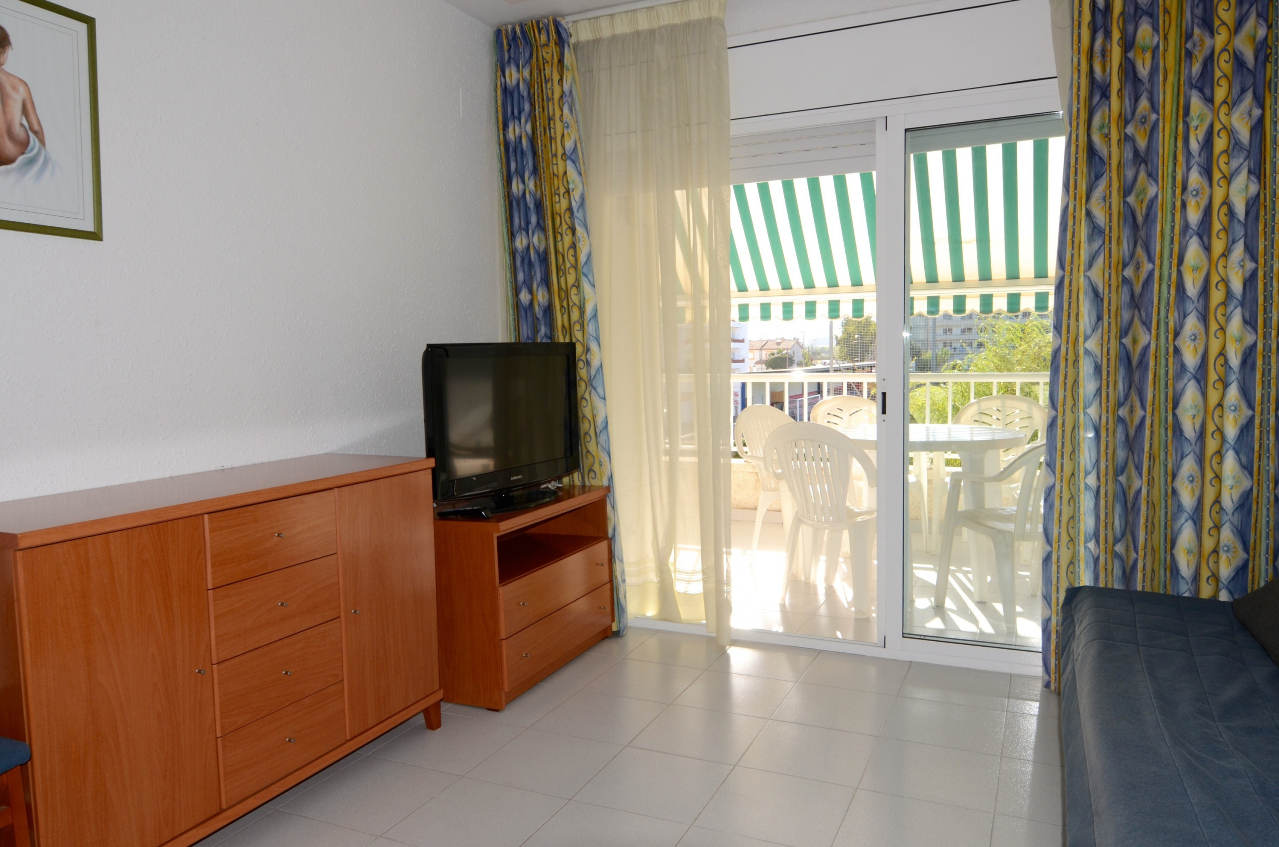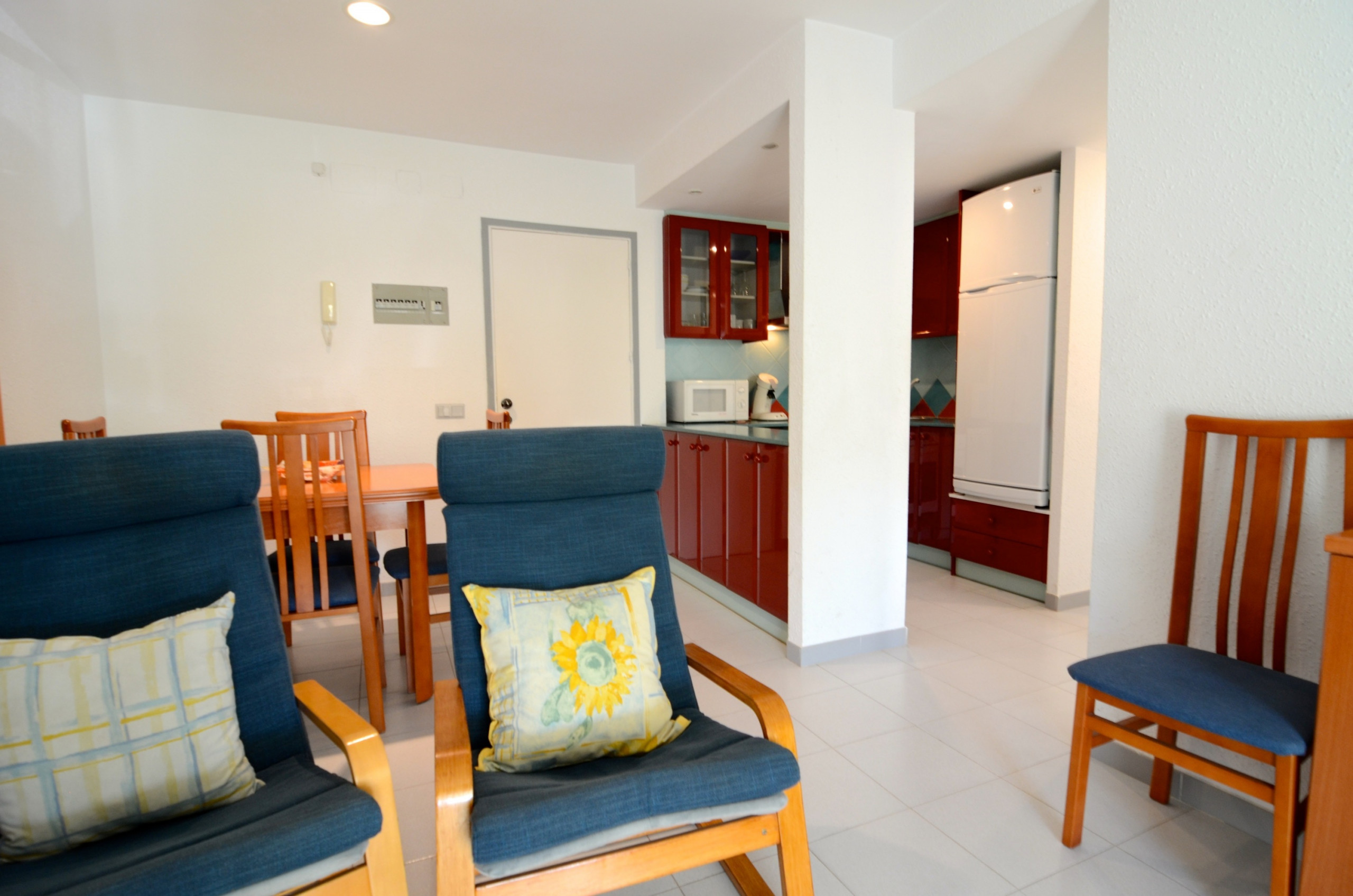 In der Anlage Rocamaura steht diese Ein-Zimmer-Wohnung für Ferienvermietung zur Verfügung. Sie verfügt über ein Doppelstockbett und ein Einzelbett und bietet Platz für bis zu 3 Personen. Die Wohnung umfasst ein Wohn-Esszimmer mit Sofa und Fernseher, eine kleine separate Küche und ein Badezimmer mit Dusche.