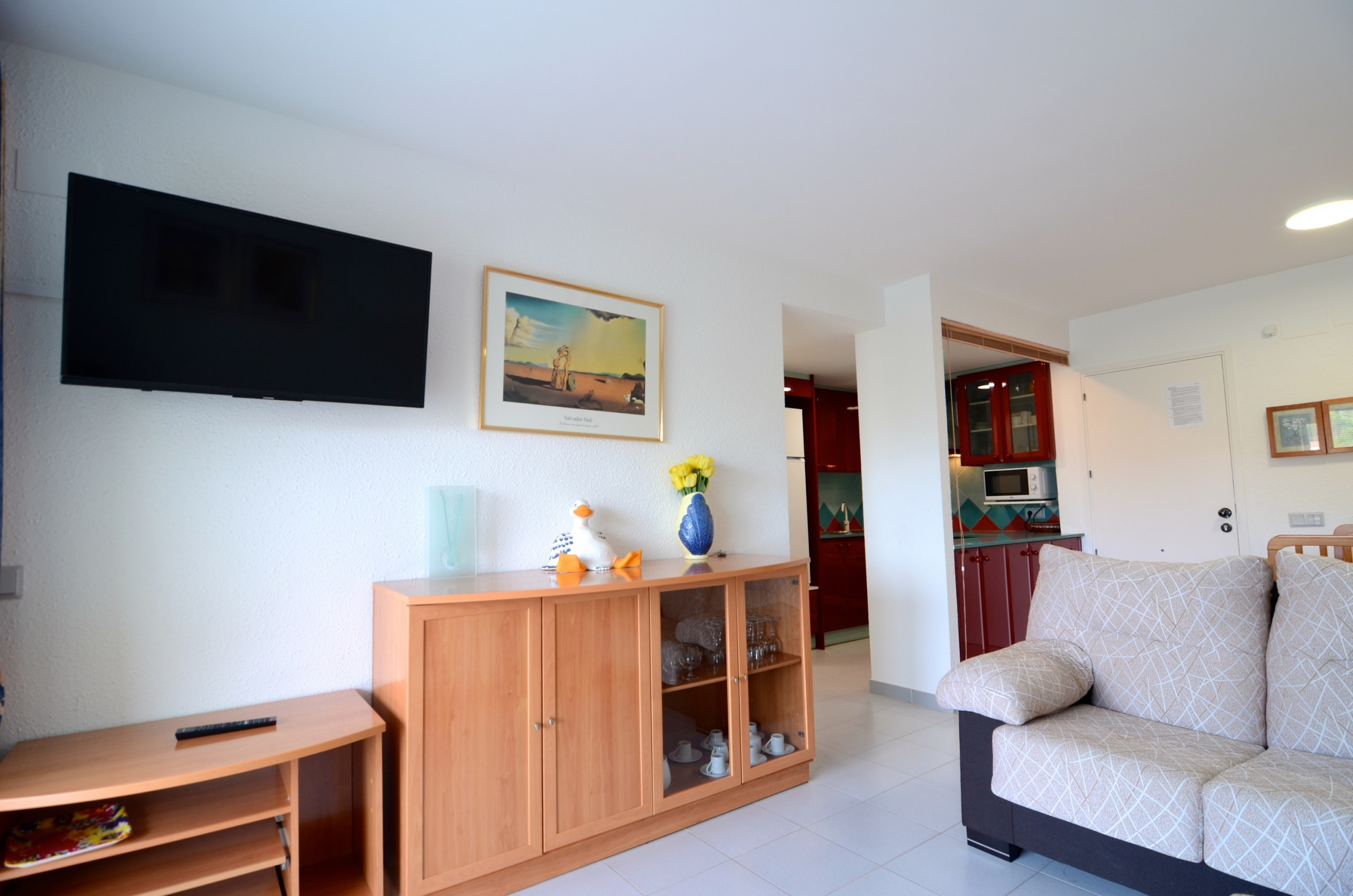 In der Anlage Rocamaura steht diese Ein-Zimmer-Wohnung für Ferienvermietung zur Verfügung. Sie verfügt über ein Doppelstockbett und ein Einzelbett und bietet Platz für bis zu 3 Personen. Die Wohnung umfasst ein Wohn-Esszimmer mit Sofa und Fernseher, eine kleine separate Küche und ein Badezimmer mit Dusche.