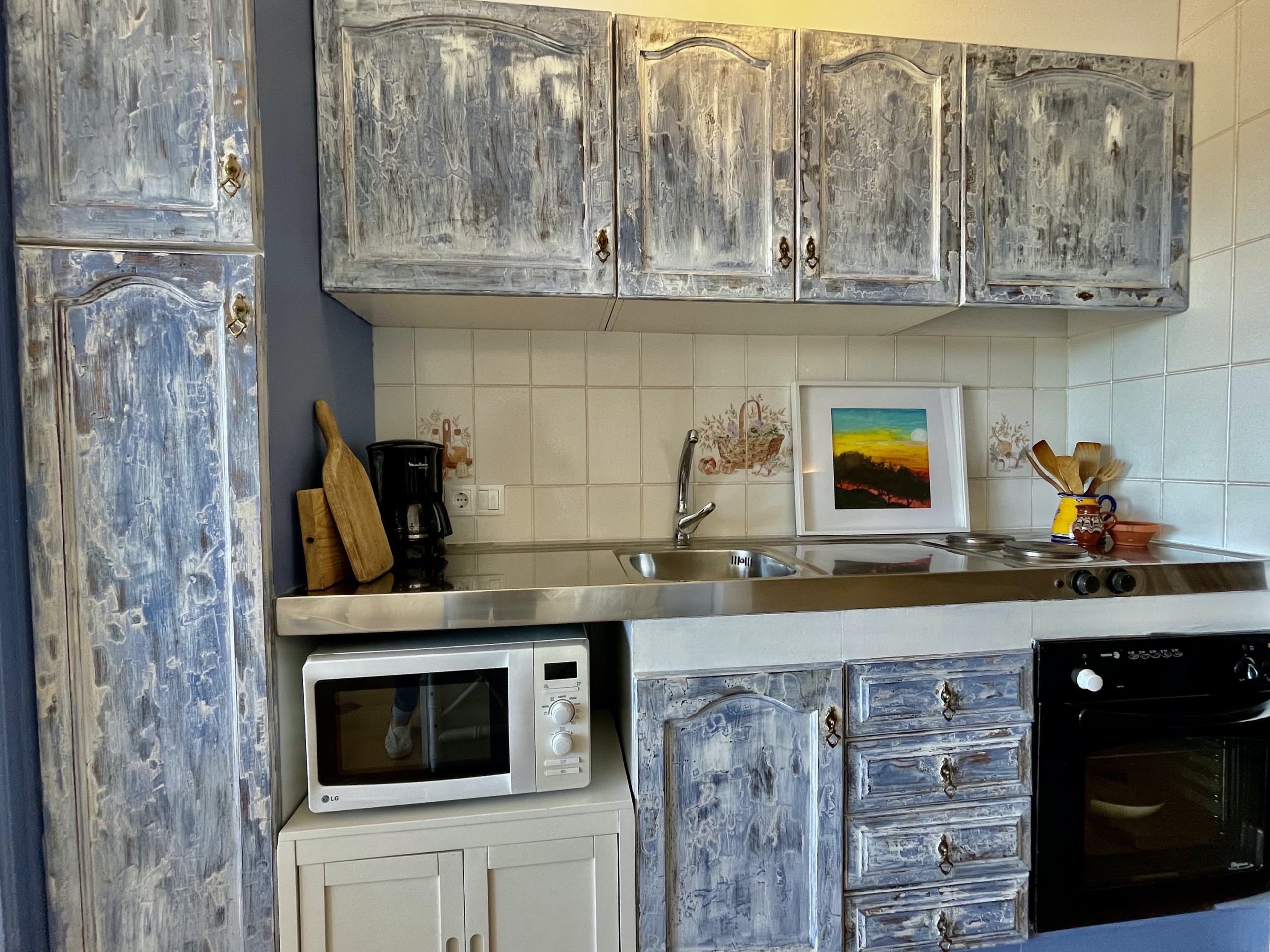 In der offenen elektrischen Küche entdecken Sie alle notwendigen Utensilien für Ihre kulinarischen Bedürfnisse, darunter einen Kühlschrank, eine Mikrowelle, einen Backofen, einen Gefrierschrank, eine Waschmaschine, Geschirr/Besteck, Küchenutensilien, eine Kaffeemaschine, einen Toaster und eine Saftpresse.