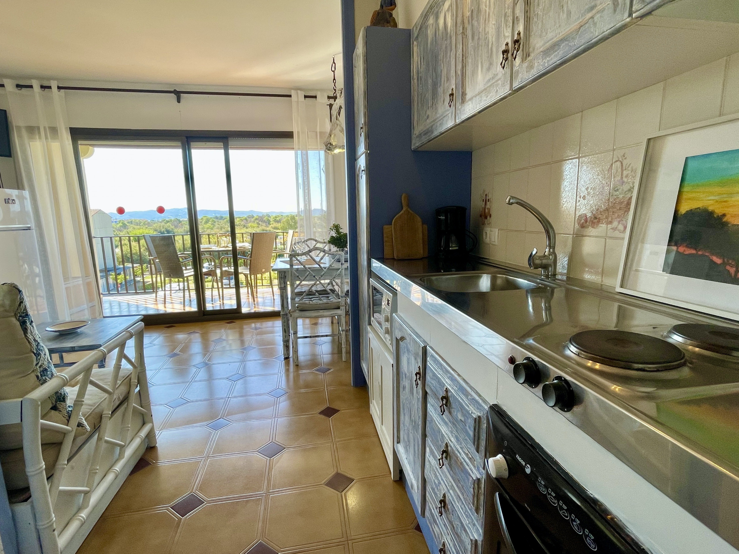 In der Anlage Rocamaura steht diese Ein-Zimmer-Wohnung für Ferienvermietung zur Verfügung. Sie verfügt über ein Doppelstockbett und ein Einzelbett und bietet Platz für bis zu 3 Personen. Die Wohnung umfasst ein Wohn-Esszimmer mit Sofa und Fernseher, eine kleine separate Küche und ein Badezimmer mit Dusche.