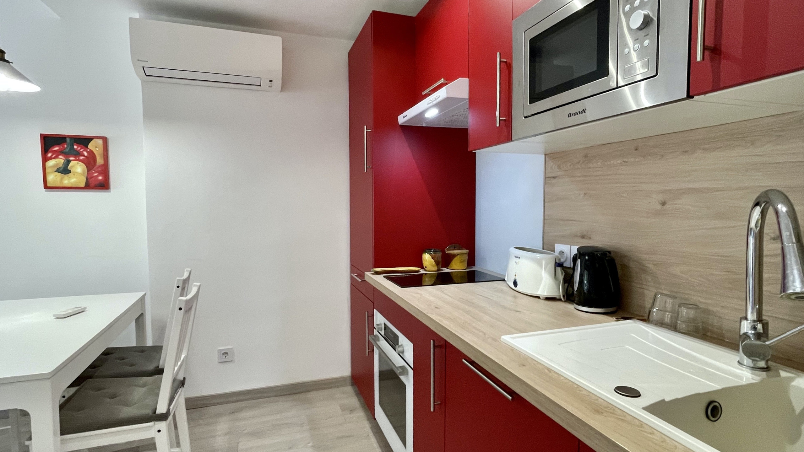 Die Wohnung verfügt über zwei Schlafzimmer, die bequem bis zu 4 Personen aufnehmen können, mit einer Aufteilung von 2 Einzelbetten und 2 Stockbetten. Der Wohnbereich verfügt über eine Klimaanlage, um während der heißesten Tage eine angenehme Atmosphäre zu gewährleisten, und eine voll ausgestattete offene Küche mit modernen Haushaltsgeräten wie Kühlschrank, Waschmaschine, Ofen, Mikrowelle, Kaffeemaschine und Toaster.