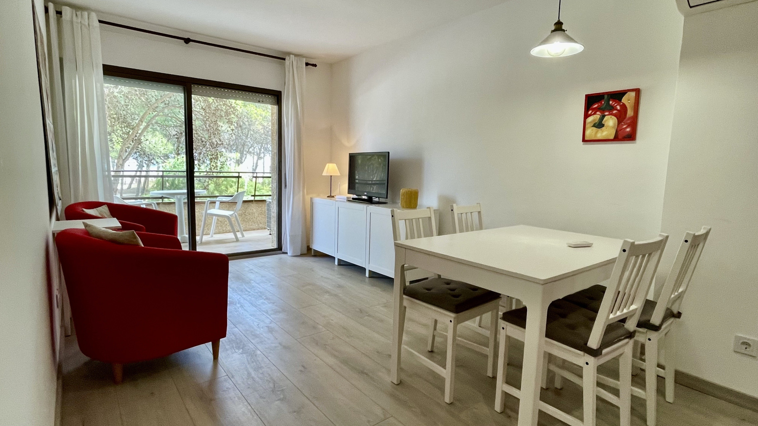 In der Anlage Rocamaura steht diese Ein-Zimmer-Wohnung für Ferienvermietung zur Verfügung. Sie verfügt über ein Doppelstockbett und ein Einzelbett und bietet Platz für bis zu 3 Personen. Die Wohnung umfasst ein Wohn-Esszimmer mit Sofa und Fernseher, eine kleine separate Küche und ein Badezimmer mit Dusche.