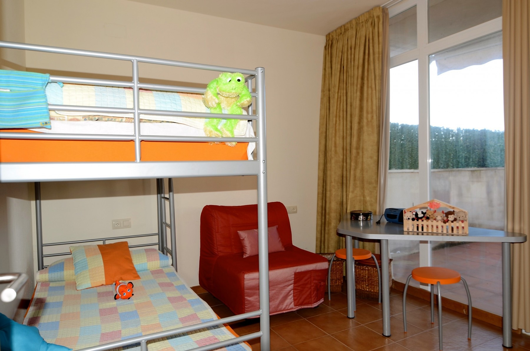 Auf der oberen Ebene werden Sie von zwei komfortablen Einzelbetten und einem kleinen Wohnzimmer mit einem praktischen Schlafsofa und einem Fernseher überrascht, perfekt zum Entspannen nach einem spaßigen Tag am Strand.