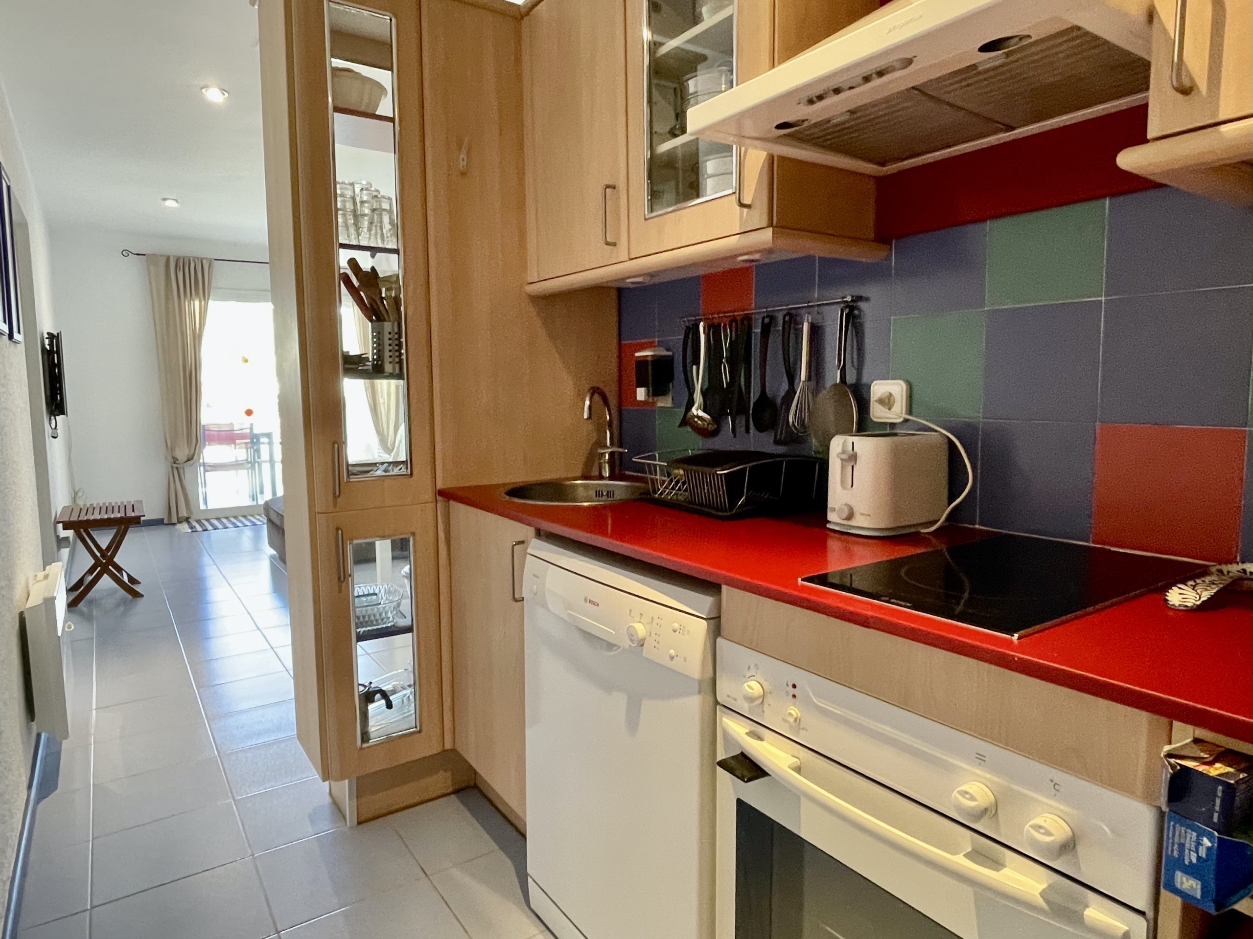 Die Wohnung verfügt über eine voll ausgestattete Küche mit Glaskeramikkochfeld, Kühlschrank, Backofen, Gefrierschrank, Waschmaschine, Geschirrspüler, Kaffeemaschine und Toaster.