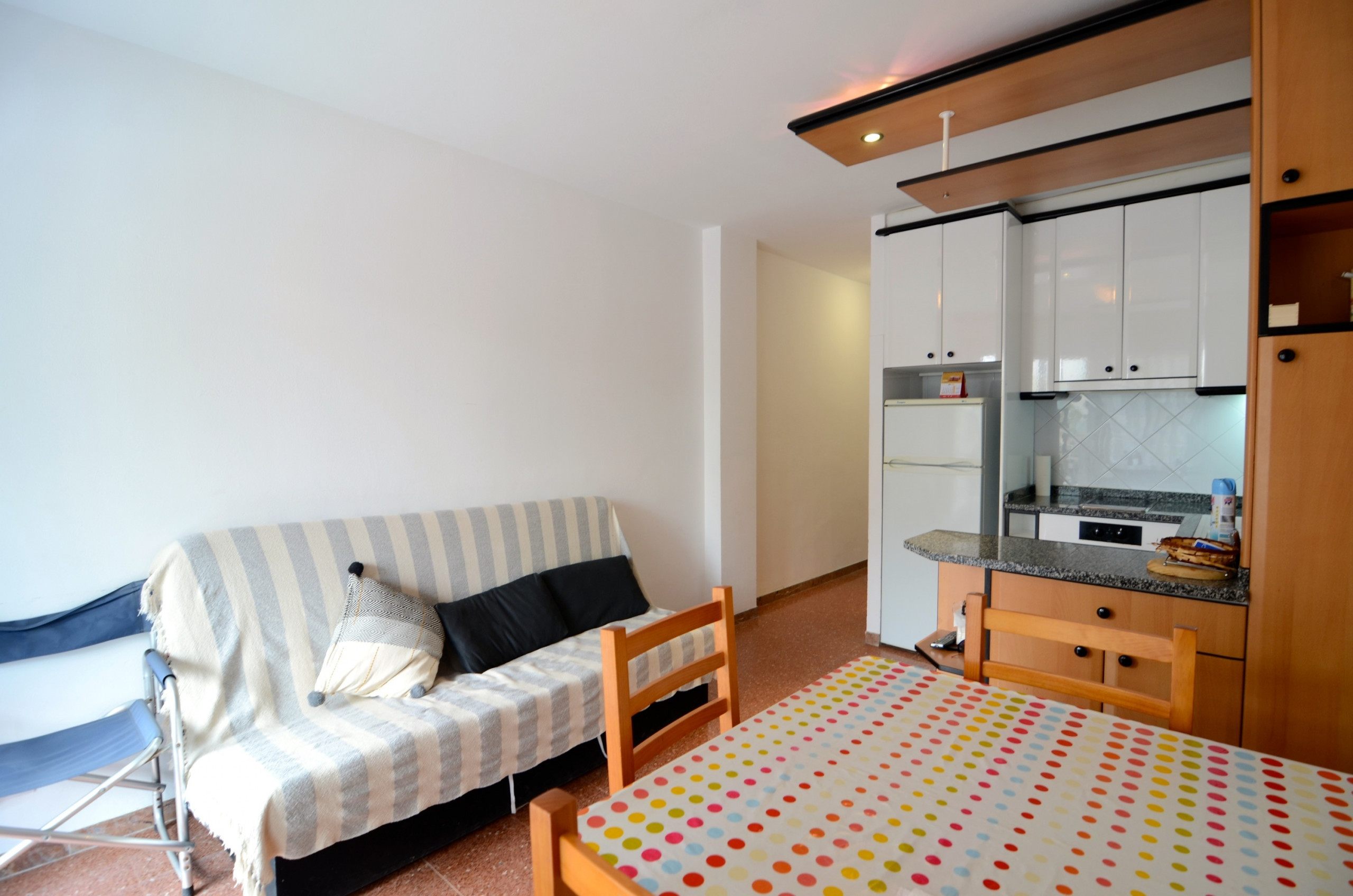 In der Anlage Rocamaura steht diese Ein-Zimmer-Wohnung für Ferienvermietung zur Verfügung. Sie verfügt über ein Doppelstockbett und ein Einzelbett und bietet Platz für bis zu 3 Personen. Die Wohnung umfasst ein Wohn-Esszimmer mit Sofa und Fernseher, eine kleine separate Küche und ein Badezimmer mit Dusche.