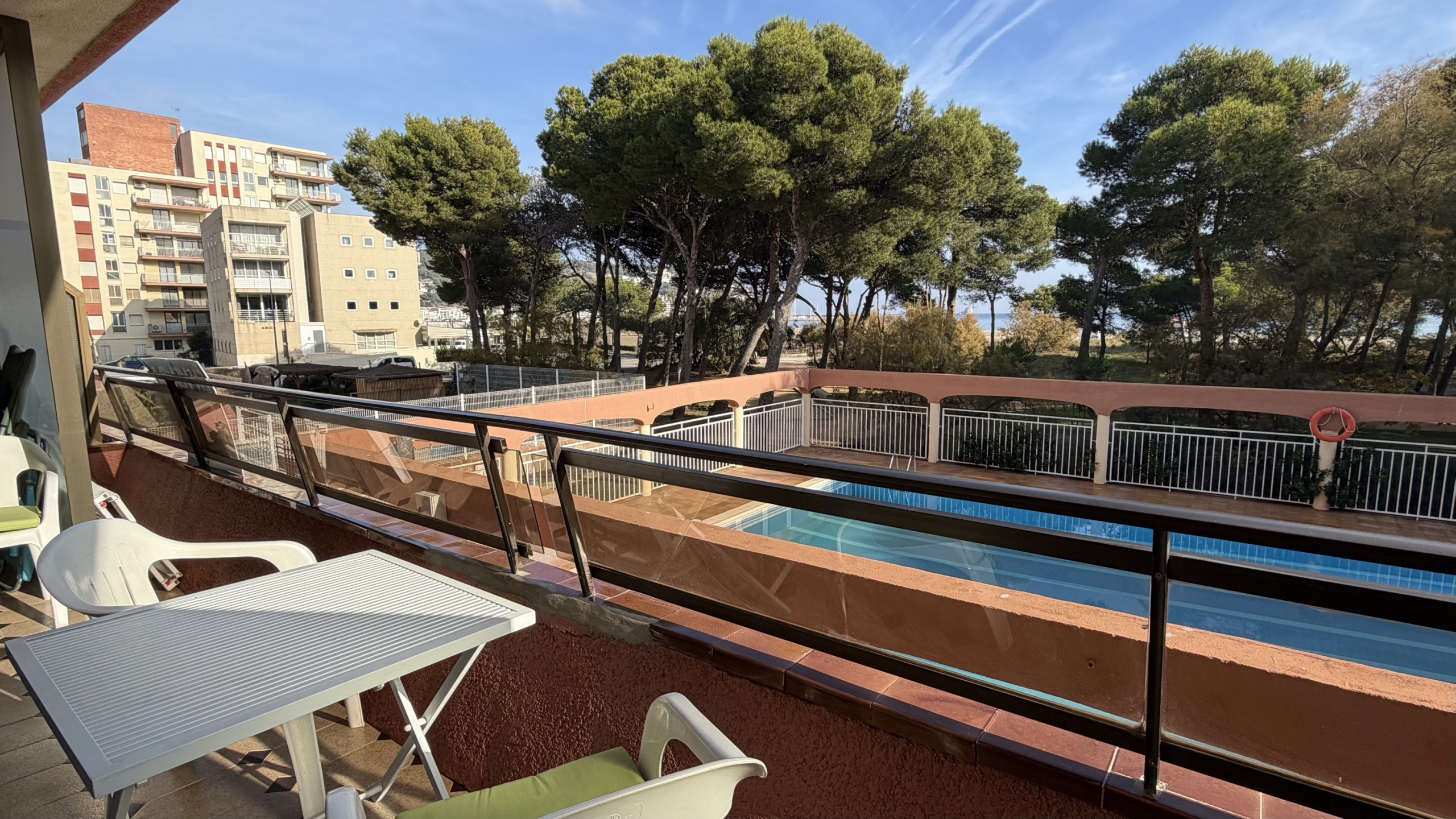 Die Wohnung verfügt über eine große Terrasse mit einem unschlagbaren Blick auf die gesamte Anlage Rocamaura, mit dem Pool zu Ihren Füßen und den Medes-Inseln im Hintergrund.