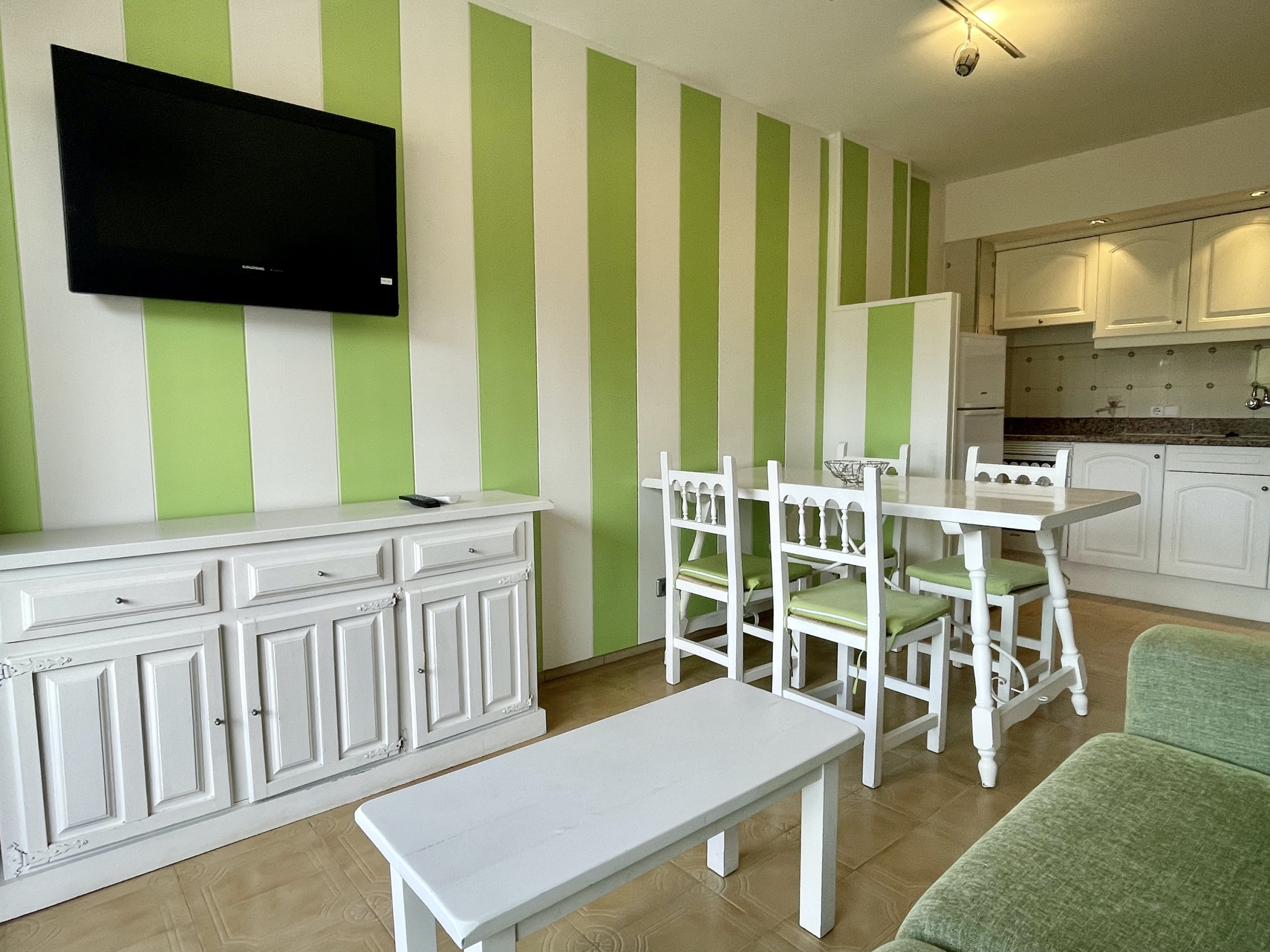 In der Anlage Rocamaura steht diese Ein-Zimmer-Wohnung für Ferienvermietung zur Verfügung. Sie verfügt über ein Doppelstockbett und ein Einzelbett und bietet Platz für bis zu 3 Personen. Die Wohnung umfasst ein Wohn-Esszimmer mit Sofa und Fernseher, eine kleine separate Küche und ein Badezimmer mit Dusche.