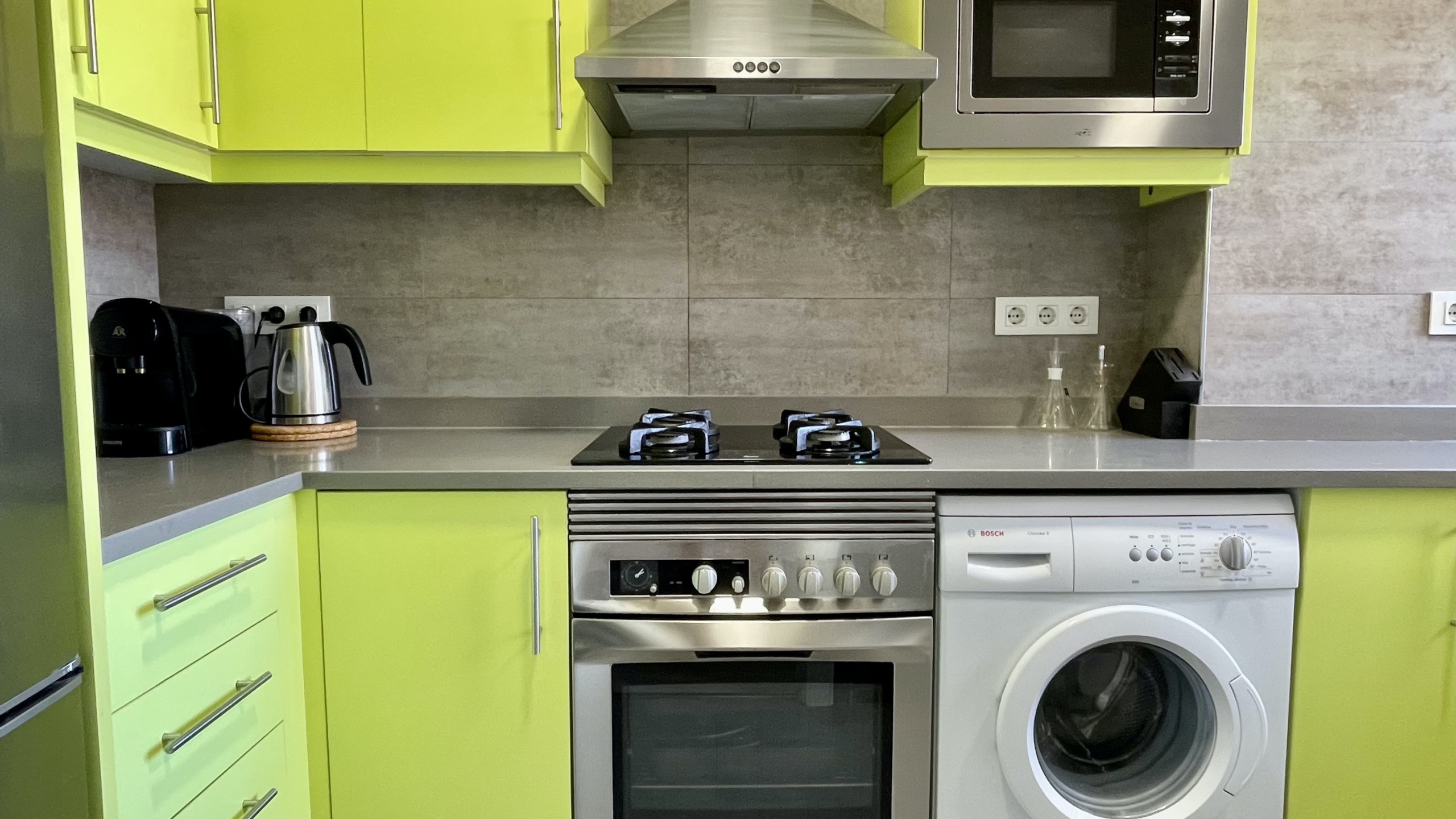 Die Küche ist voll ausgestattet mit Kühlschrank, Mikrowelle, Backofen, Gefrierschrank, Waschmaschine, Geschirrspüler und allem notwendigen Geschirr, Besteck und Utensilien. Ob Sie einen ruhigen Morgenkaffee genießen oder eine Mahlzeit zubereiten, diese Küche entspricht Ihren Bedürfnissen.