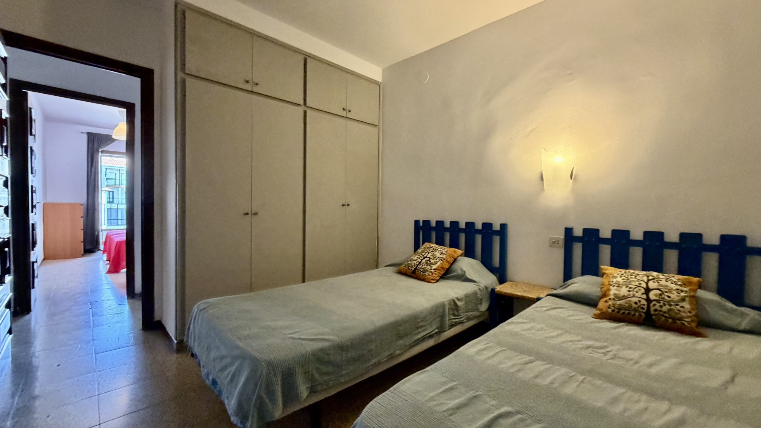 Die Wohnung verfügt über 3 Schlafzimmer, ausgestattet mit 5 Betten: 1 Doppelbett und 4 Einzelbetten, ideal für Gruppen, die Flexibilität beim Ausruhen suchen. Es gibt ein vollständiges Badezimmer mit Badewanne, perfekt zum Entspannen nach einem Tag am Strand.