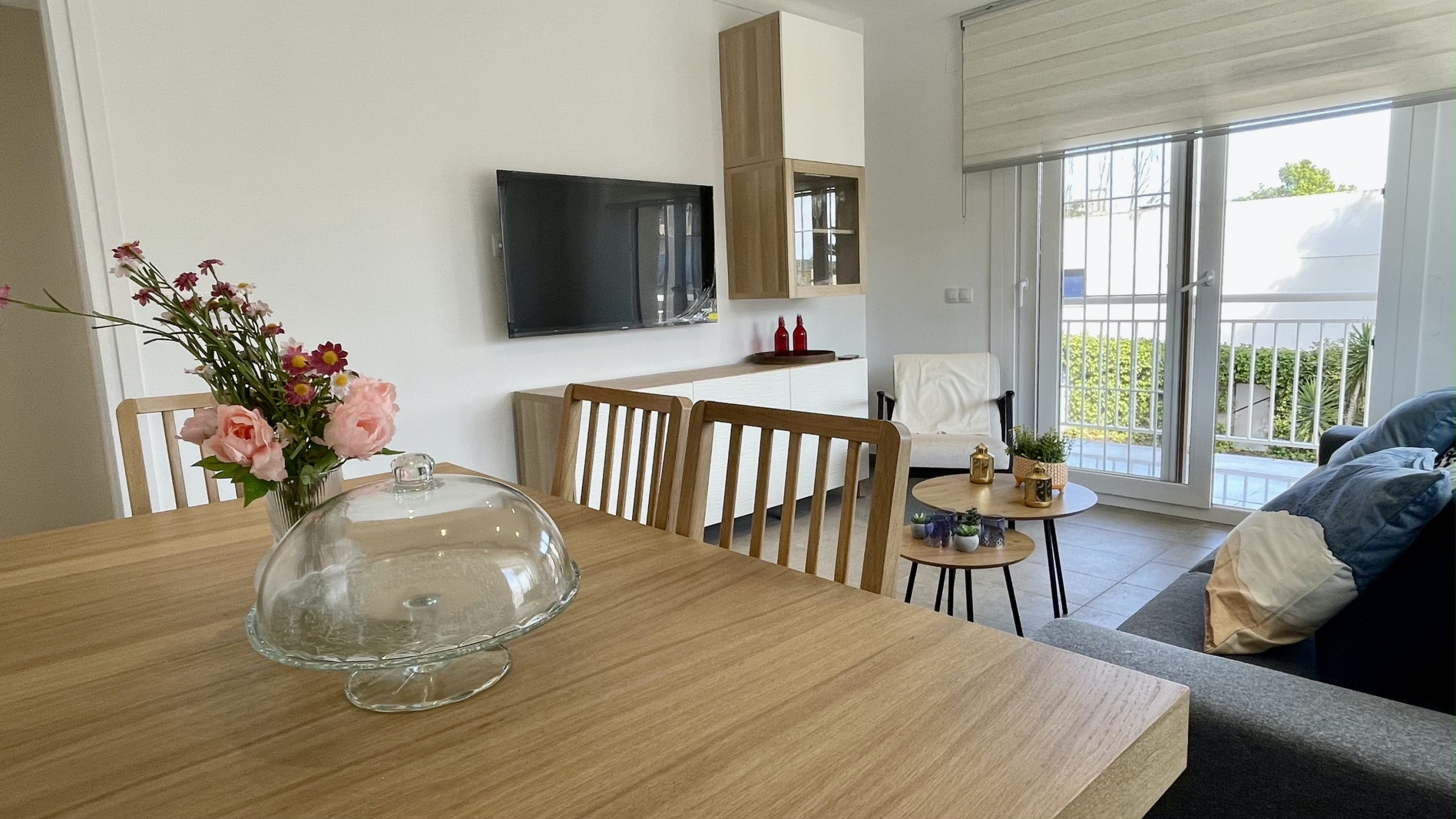 Der Wohnbereich verfügt über Klimaanlage im Wohnzimmer, die an heißen Tagen eine angenehme und kühle Atmosphäre schafft. Bleiben Sie dank WLAN in der gesamten Wohnung verbunden.