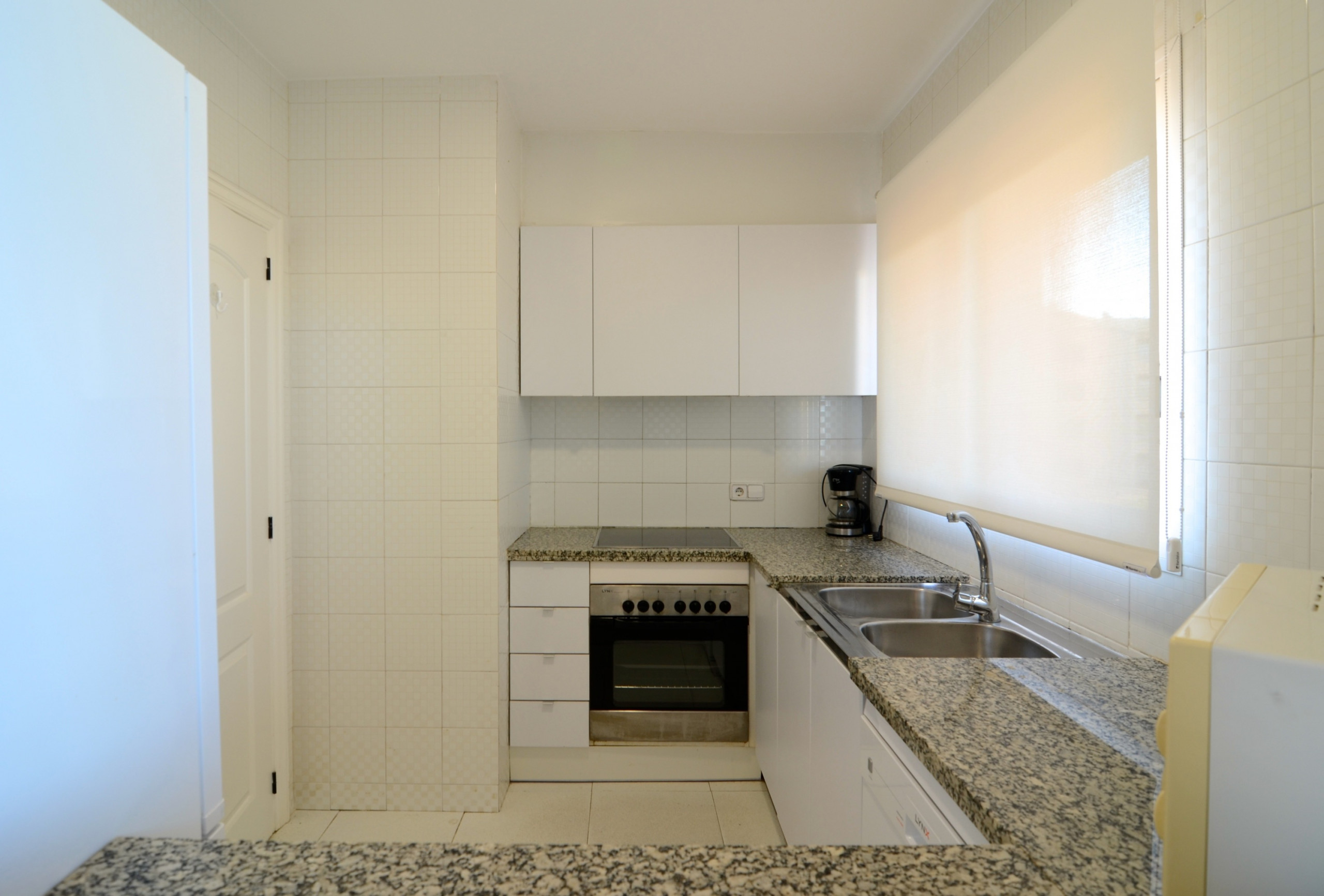 Die Offene Küche mit Ceranfeld ist ausgestattet in einen Kühlschrank, eine Mikrowelle, eine Waschmaschine, Geschirr/Besteck, Kochutensilien, eine Kaffeemaschine und einen Toaster.