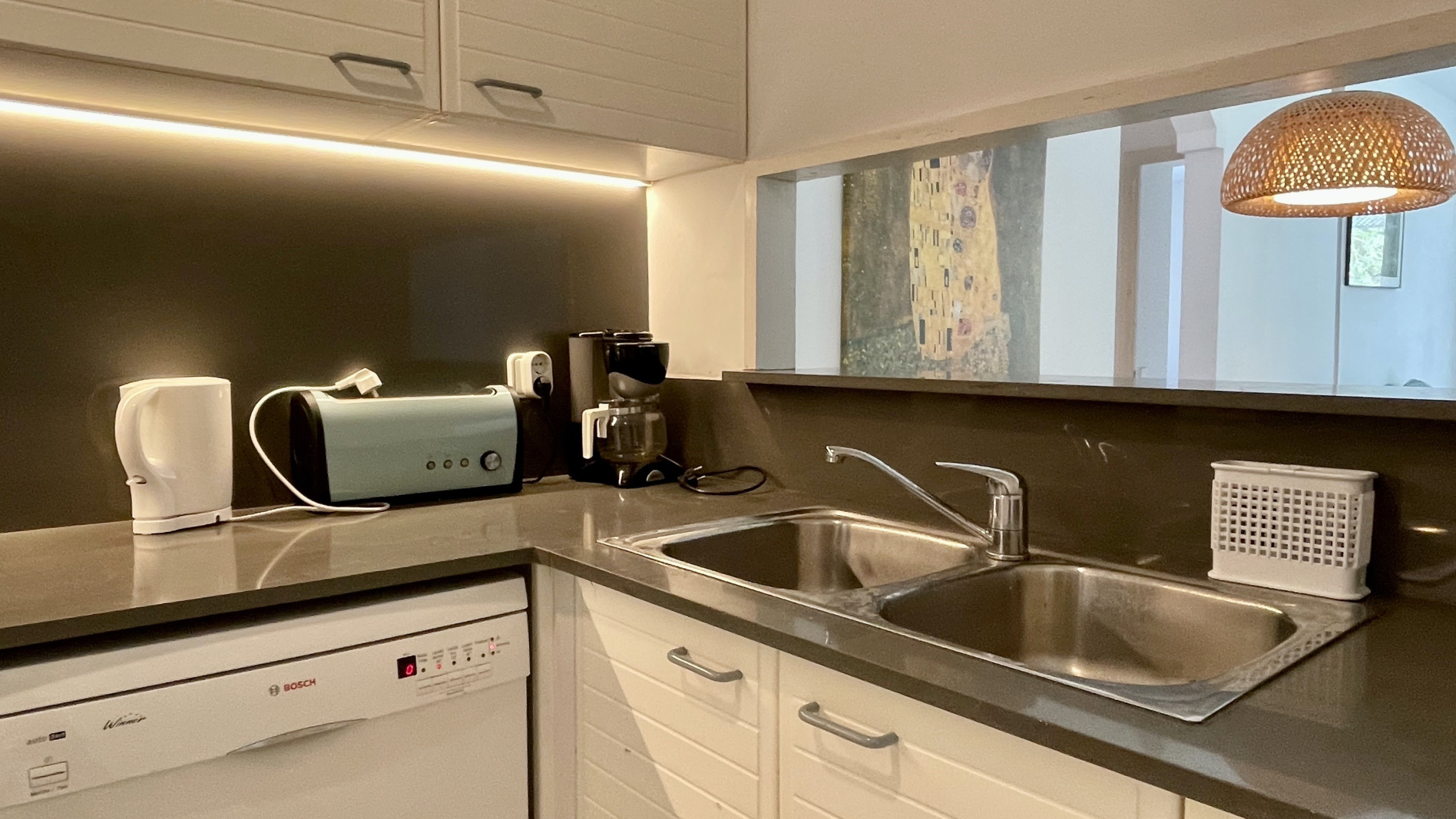 Die Separate Küche mit Ceranfeld ist ausgestattet in einen Kühlschrank, eine Mikrowelle, ein Backofen, Gefrierschrank, eine Waschmaschine, eine Spülmaschine, Geschirr/Besteck, Kochutensilien, eine Kaffeemaschine und einen Toaster.