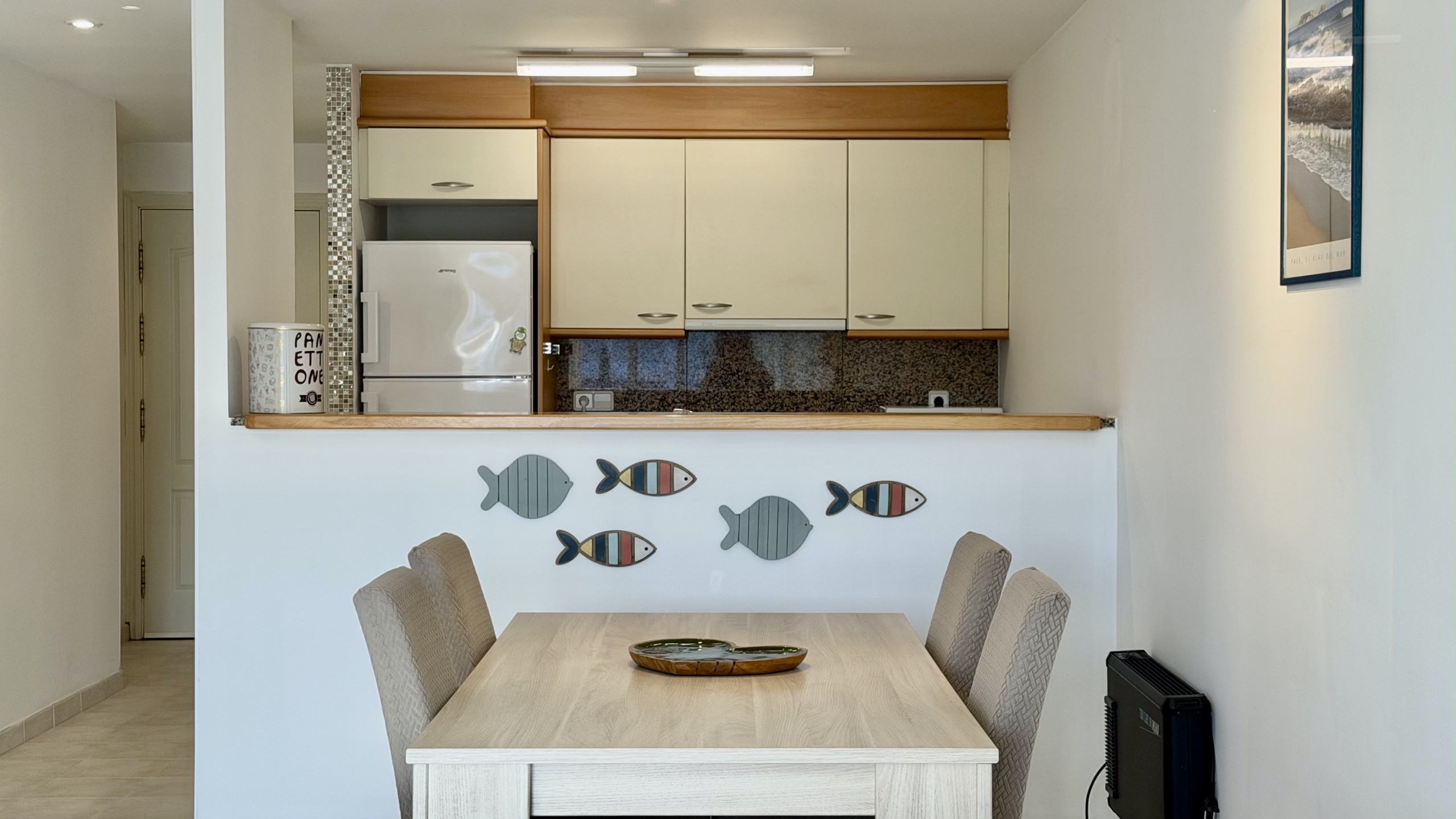 Die amerikanische Küche ist komplett mit modernen Haushaltsgeräten ausgestattet, einschließlich Waschmaschine, Geschirrspüler, Backofen, Mikrowelle, Toaster und Kaffeemaschine. Sie verfügt über Kühlschrank und Gefrierschrank, um die Lebensmittel während des Aufenthalts frisch zu halten. Die Wohnung bietet 3 Betten: ein Doppelbett und zwei Einzelbetten, die sich perfekt an verschiedene Familienkonfigurationen anpassen.