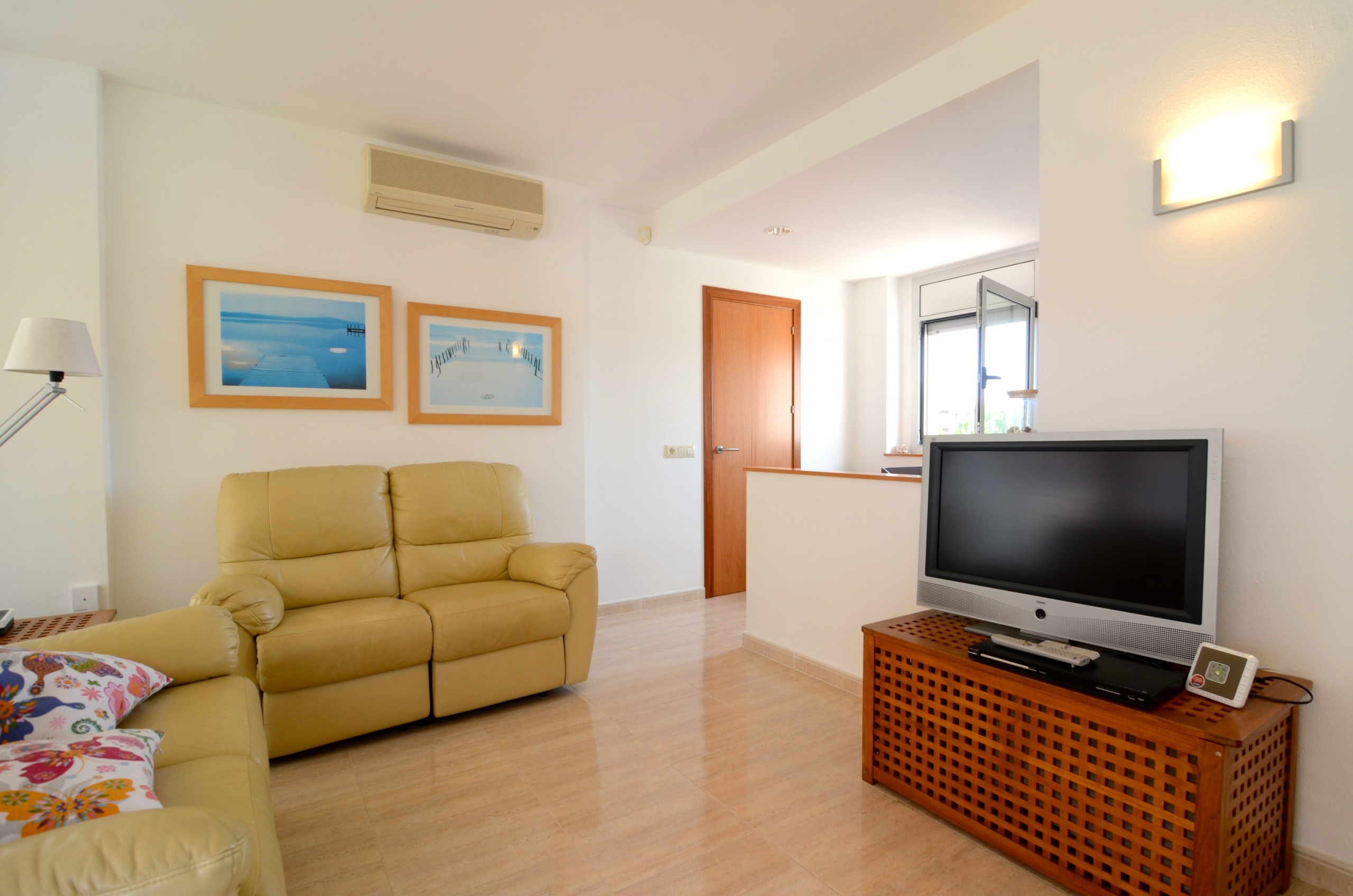 De bovenverdieping herbergt het sociale gedeelte, inclusief een lichte woonkamer, eetkamer en een volledig uitgeruste keuken, allemaal geïntegreerd in één ruimte. Ook op deze verdieping bevindt zich een extra toilet en een ruim terras met een prachtig uitzicht op de Rocamaura-berg en zijdelings uitzicht op zee.