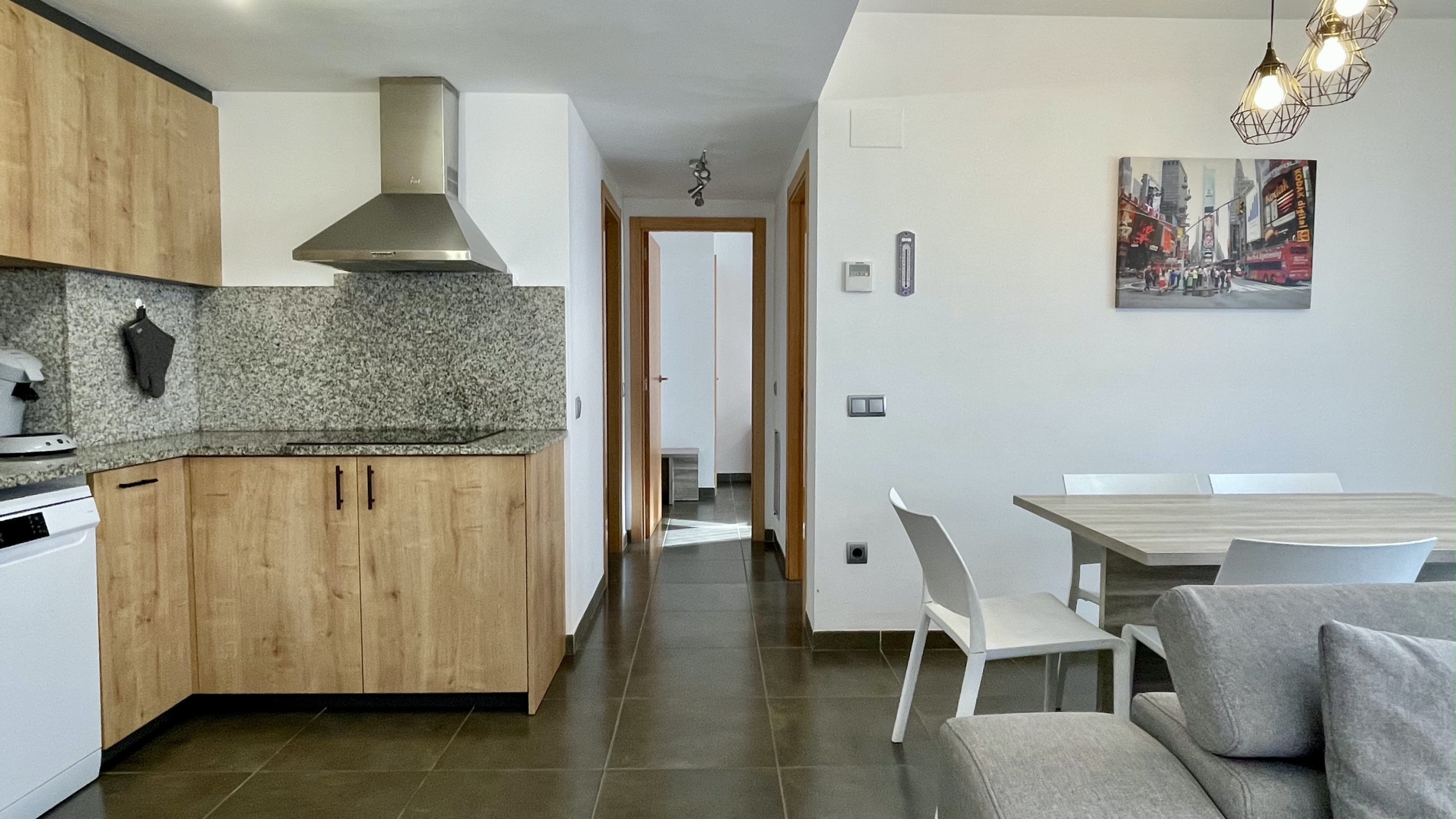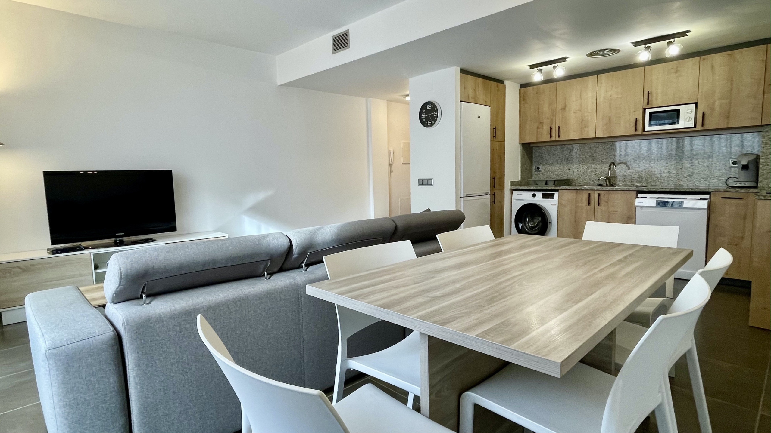 Een groot pluspunt is de overdekte privéparkeerplaats in hetzelfde gebouw, wat het binnenkomen en vertrekken met bagage of voor excursies enorm vergemakkelijkt. De ruimte is voorzien van airconditioning om een frisse omgeving te behouden tijdens de warmste dagen, en een volledig uitgeruste open keuken met moderne apparaten zoals een vaatwasser, oven, magnetron en koffiezetapparaat.
