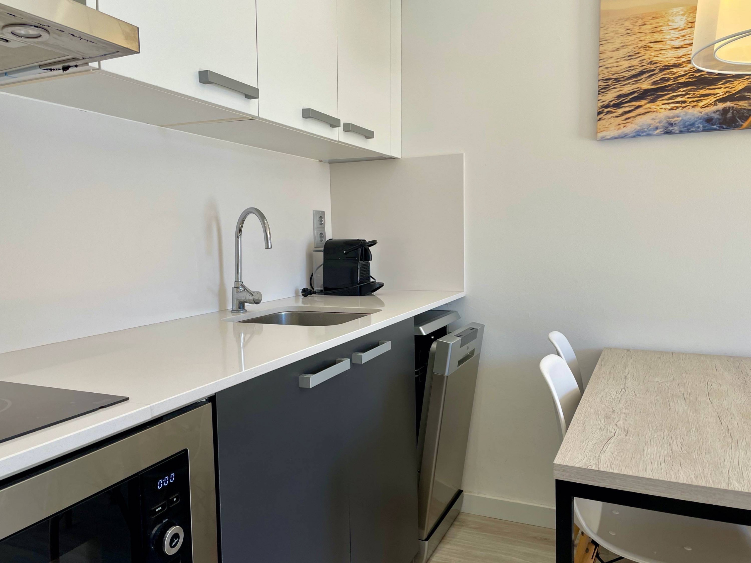 De open keuken is uitgerust met een keramisch kooksysteem en u vindt een breed scala aan apparaten, waaronder een koelkast, magnetron, vriezer, wasmachine en vaatwasser. Daarnaast worden borden, bestek, keukengerei, een koffiezetapparaat en een broodrooster verstrekt voor uw gebruik. Beddengoed is inbegrepen in de prijs en handdoeken kunnen worden toegevoegd voor 5€/persoon.