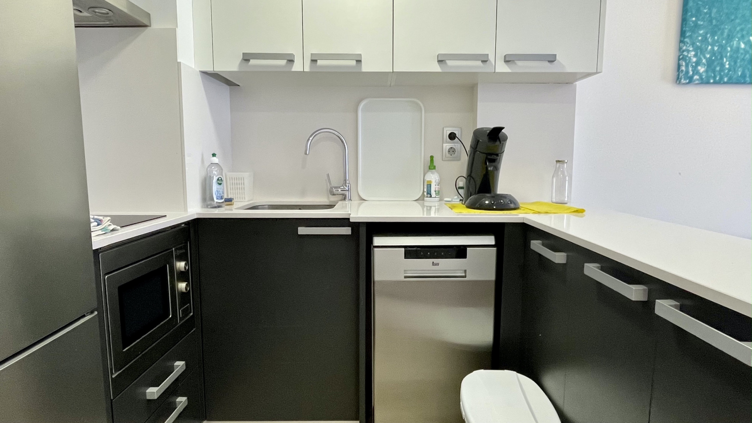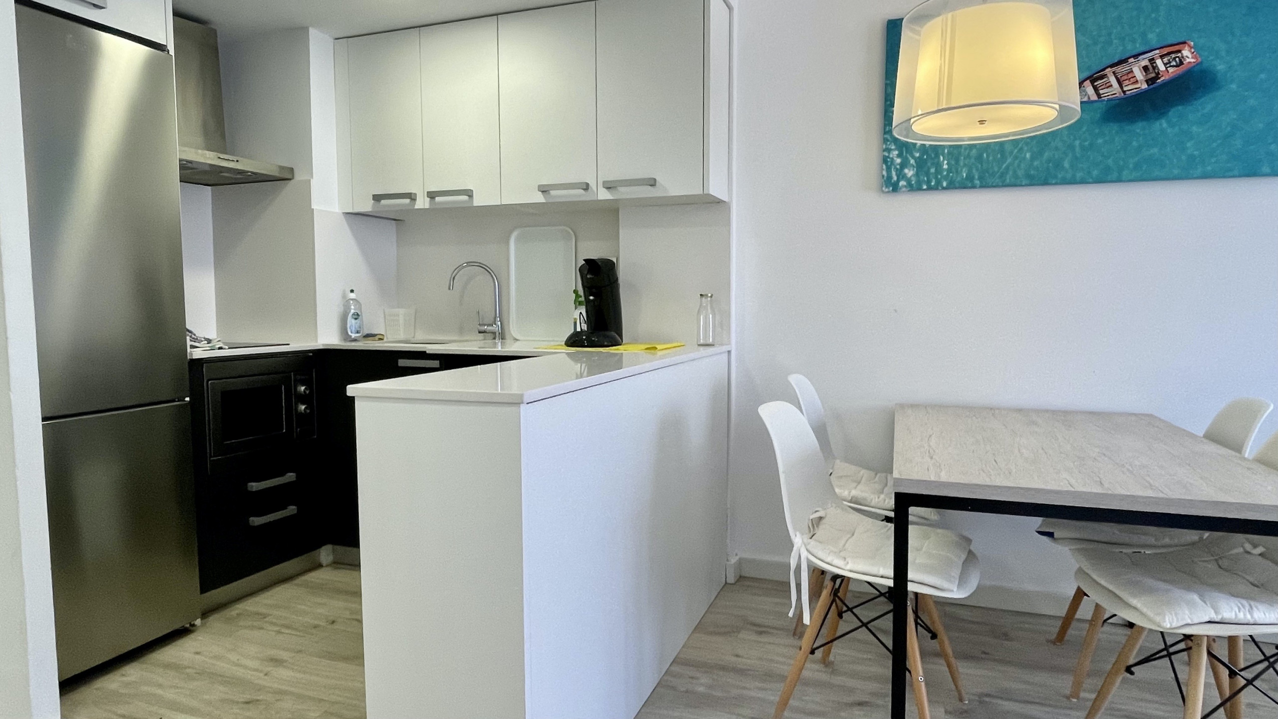 De open keuken, uitgerust met een keramisch kooksysteem, is volledig uitgerust met essentiële apparaten zoals een koelkast, magnetron, vriezer, vaatwasser, evenals servies, bestek, kookgerei, koffiezetapparaat en broodrooster. Beddengoed is inbegrepen in de prijs, en handdoeken kunnen worden toegevoegd voor 5€/persoon.