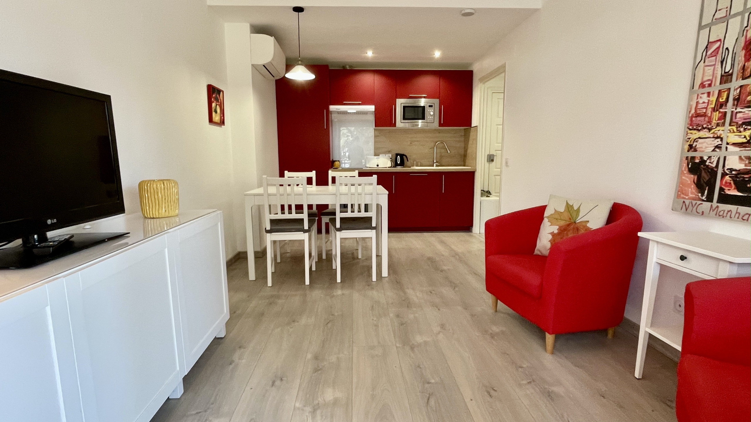 In het Rocamaura-complex wordt dit appartement met één slaapkamer te huur aangeboden voor vakanties, met een stapelbed en een eenpersoonsbed, geschikt voor 3 personen. Het heeft een woon-eetkamer met een bank en tv, een kleine aparte keuken en een badkamer met douche.