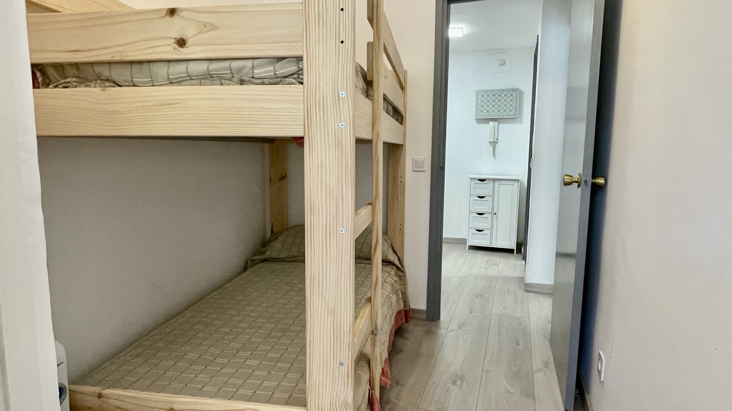 Het appartement beschikt over twee slaapkamers die comfortabel plaats kunnen bieden aan maximaal 4 personen, met een indeling van 2 enkele bedden en 2 stapelbedden. De woonkamer beschikt over airconditioning om een frisse omgeving te behouden tijdens de warmste dagen, en een open keuken die volledig is uitgerust met moderne apparaten zoals een koelkast, wasmachine, oven, magnetron, koffiezetapparaat en broodrooster.