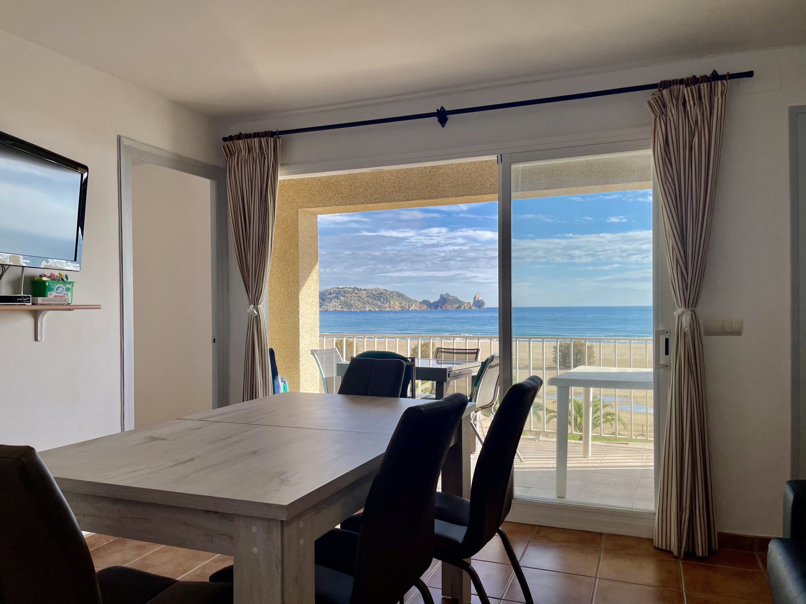 Gunstig gelegen in een gezinsvriendelijke omgeving, ligt het appartement op slechts 50 meter van het zandstrand, 150 meter van de supermarkt en 300 meter van het stadscentrum. De Empordà Golf Club ligt op slechts 9 km afstand en biedt recreatiemogelijkheden voor golfliefhebbers. Het treinstation van Flaçà ligt op 25 km afstand en de luchthaven Girona – Costa Brava is gemakkelijk bereikbaar op een afstand van 55 km.