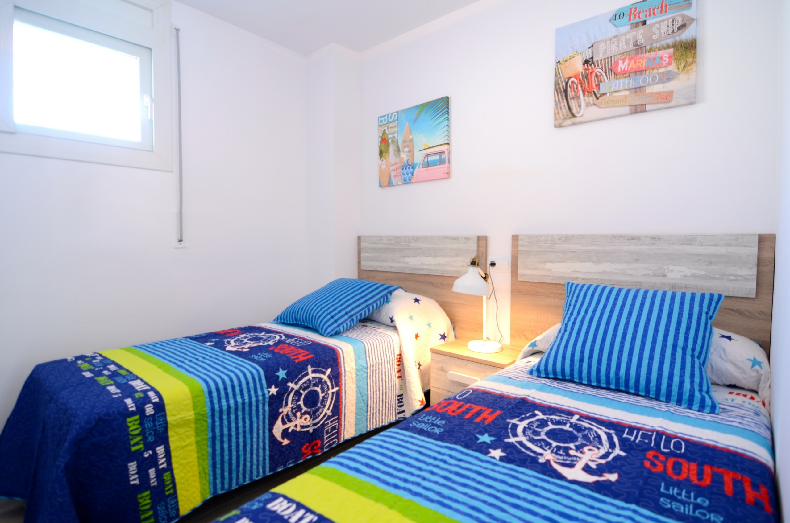Als u naar de bovenste verdieping gaat, zult u verrast worden door twee comfortabele eenpersoonsbedden en een kleine woonkamer met een praktische slaapbank en tv, ideaal om te ontspannen na een leuke dag op het strand.
