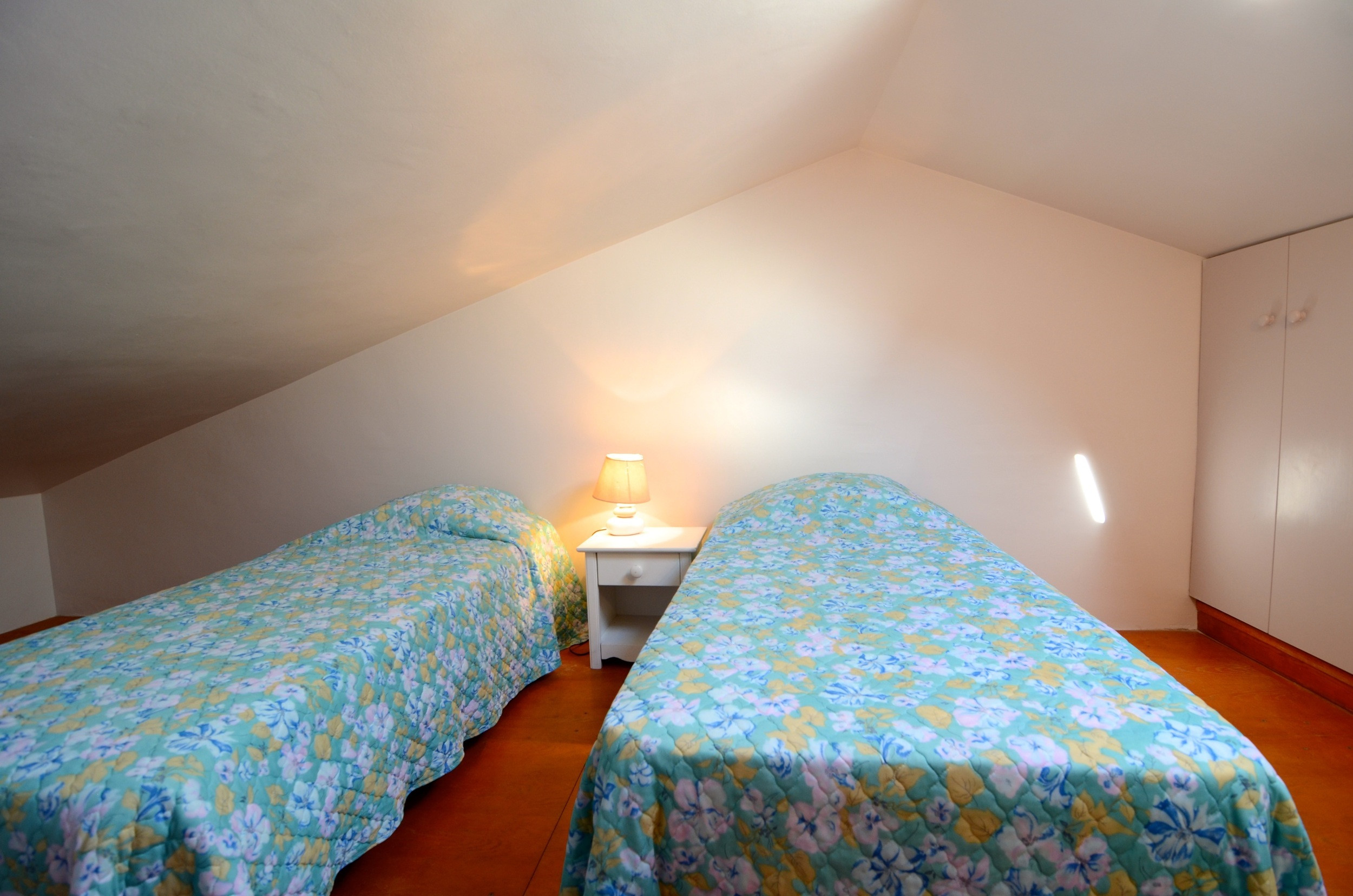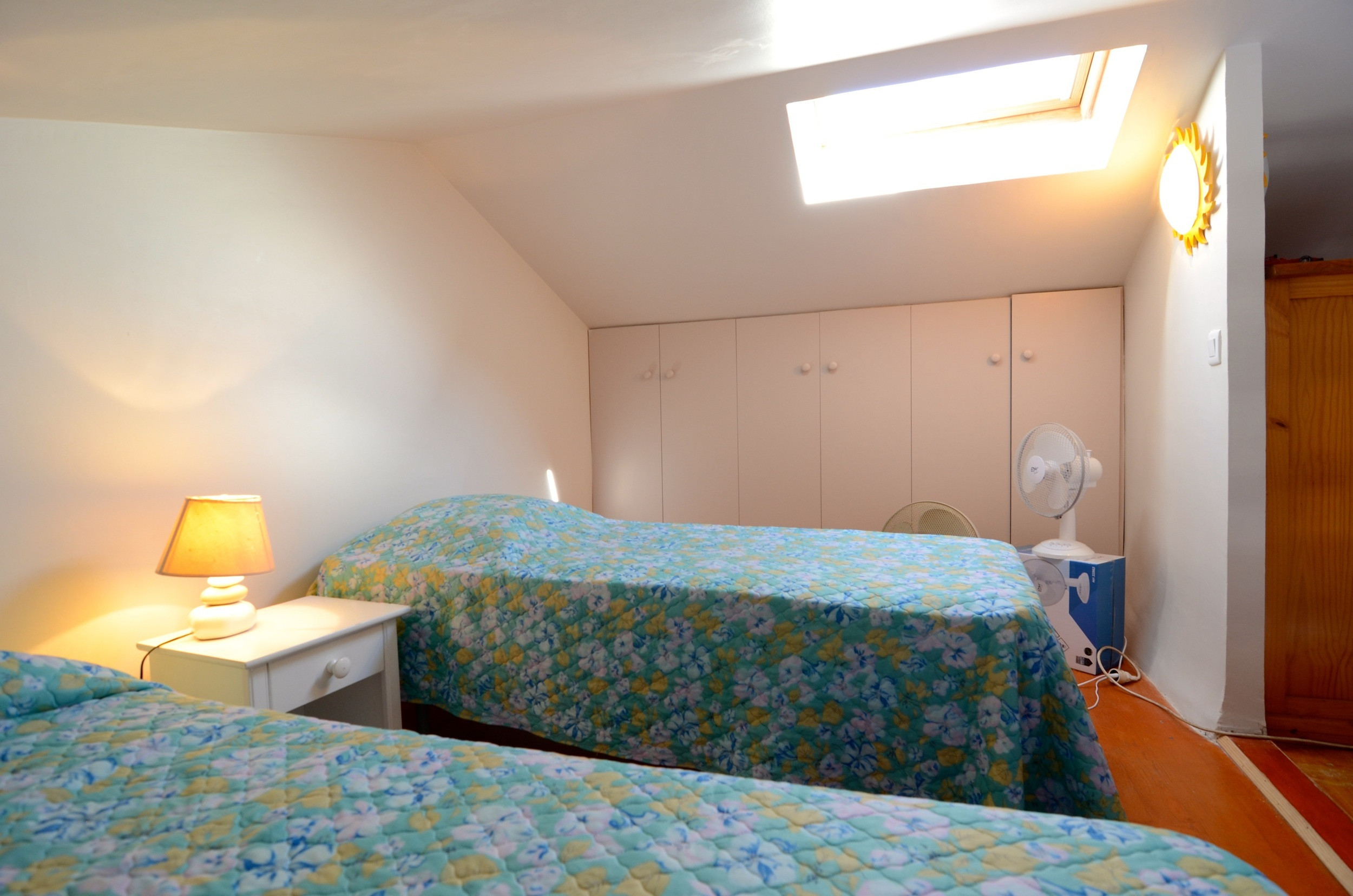 Als u naar de bovenste verdieping gaat, zult u verrast worden door twee comfortabele eenpersoonsbedden en een kleine woonkamer met een praktische slaapbank en tv, ideaal om te ontspannen na een leuke dag op het strand.
