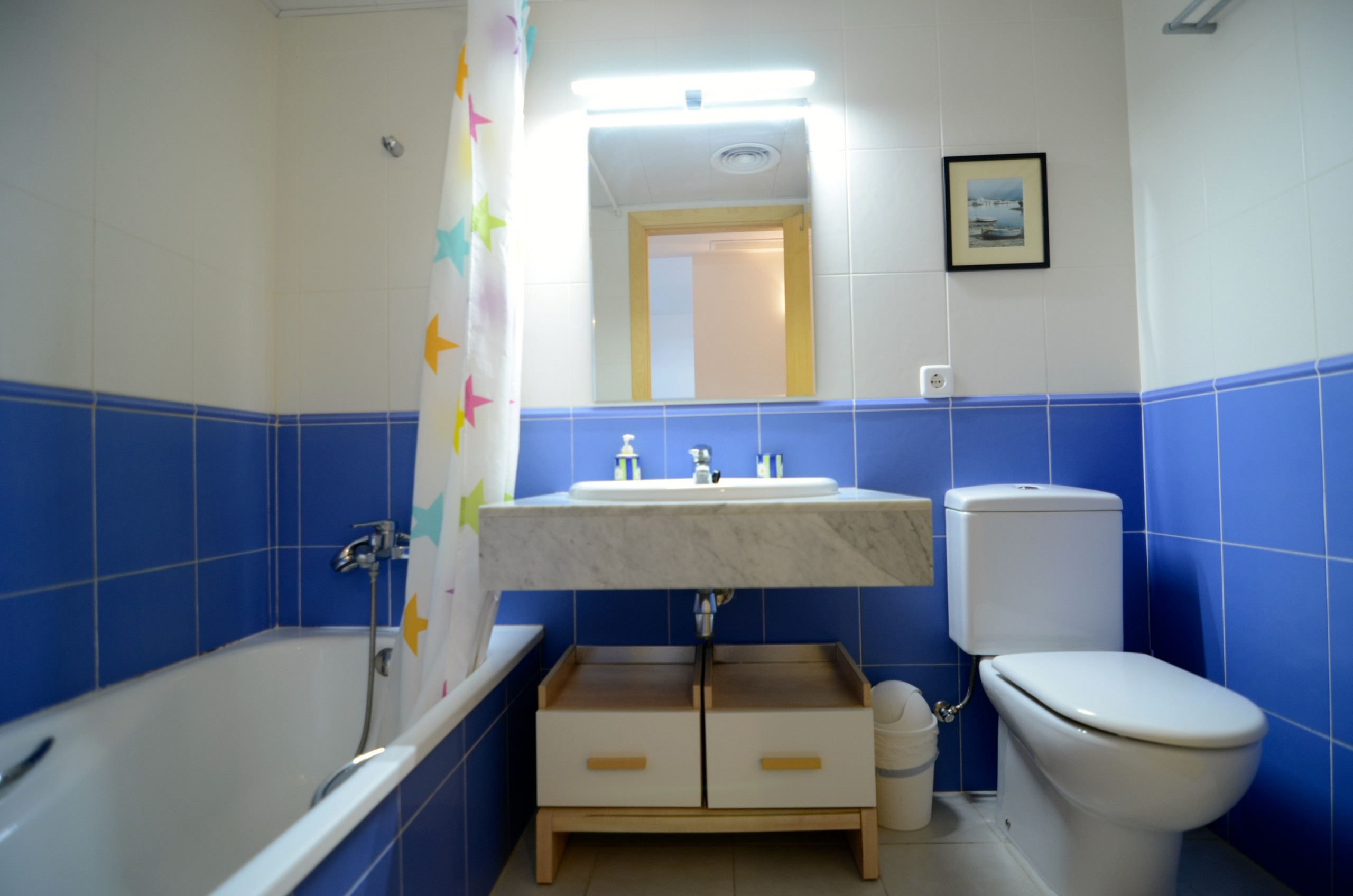 Het appartement beschikt over een hoofdslaapkamer met een tweepersoonsbed en een tweede slaapkamer met twee eenpersoonsbedden, ideaal voor kinderen of vrienden. Het heeft een complete badkamer met bad.