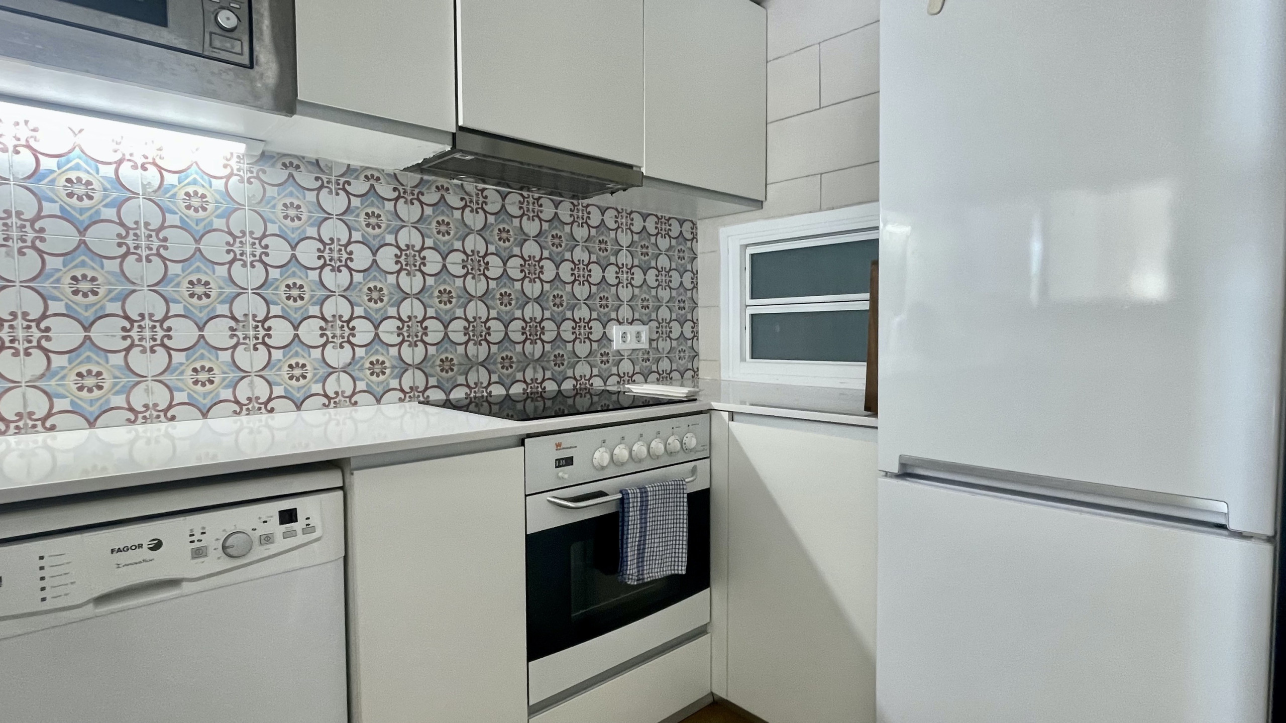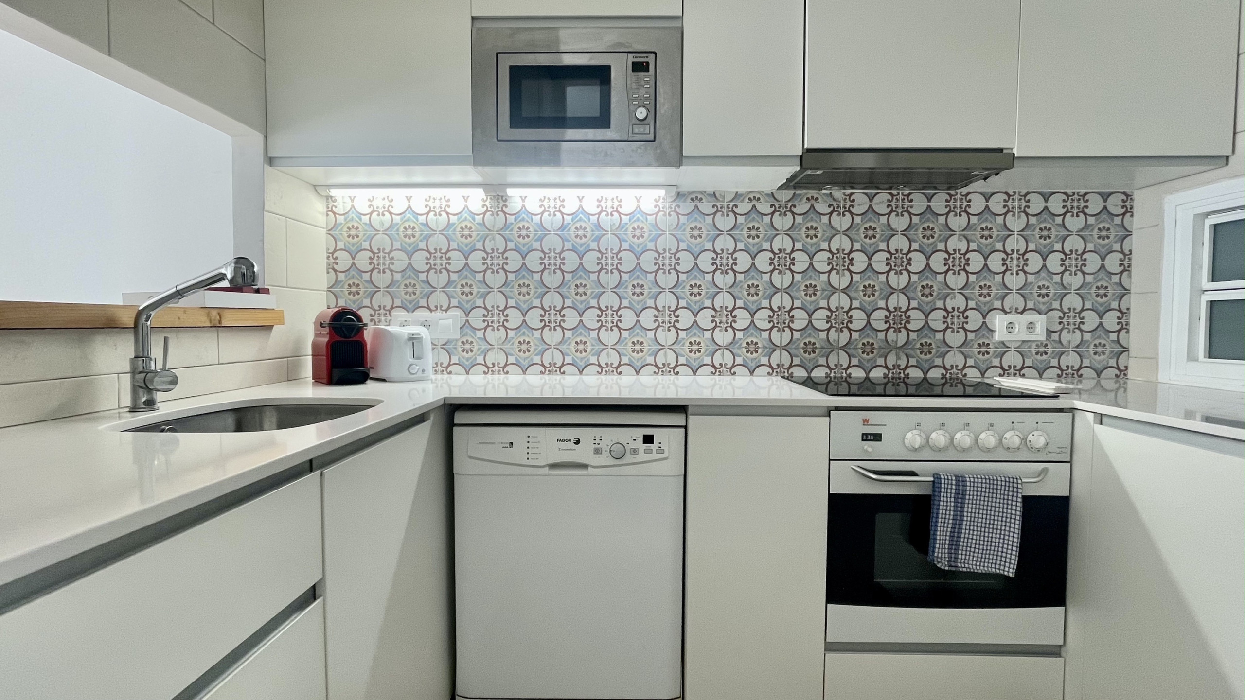 De open keuken, met keramisch fornuis, is uitgerust met koelkast, magnetron, wasmachine, servies/bestek, keukengerei, koffiezetapparaat, broodrooster en .