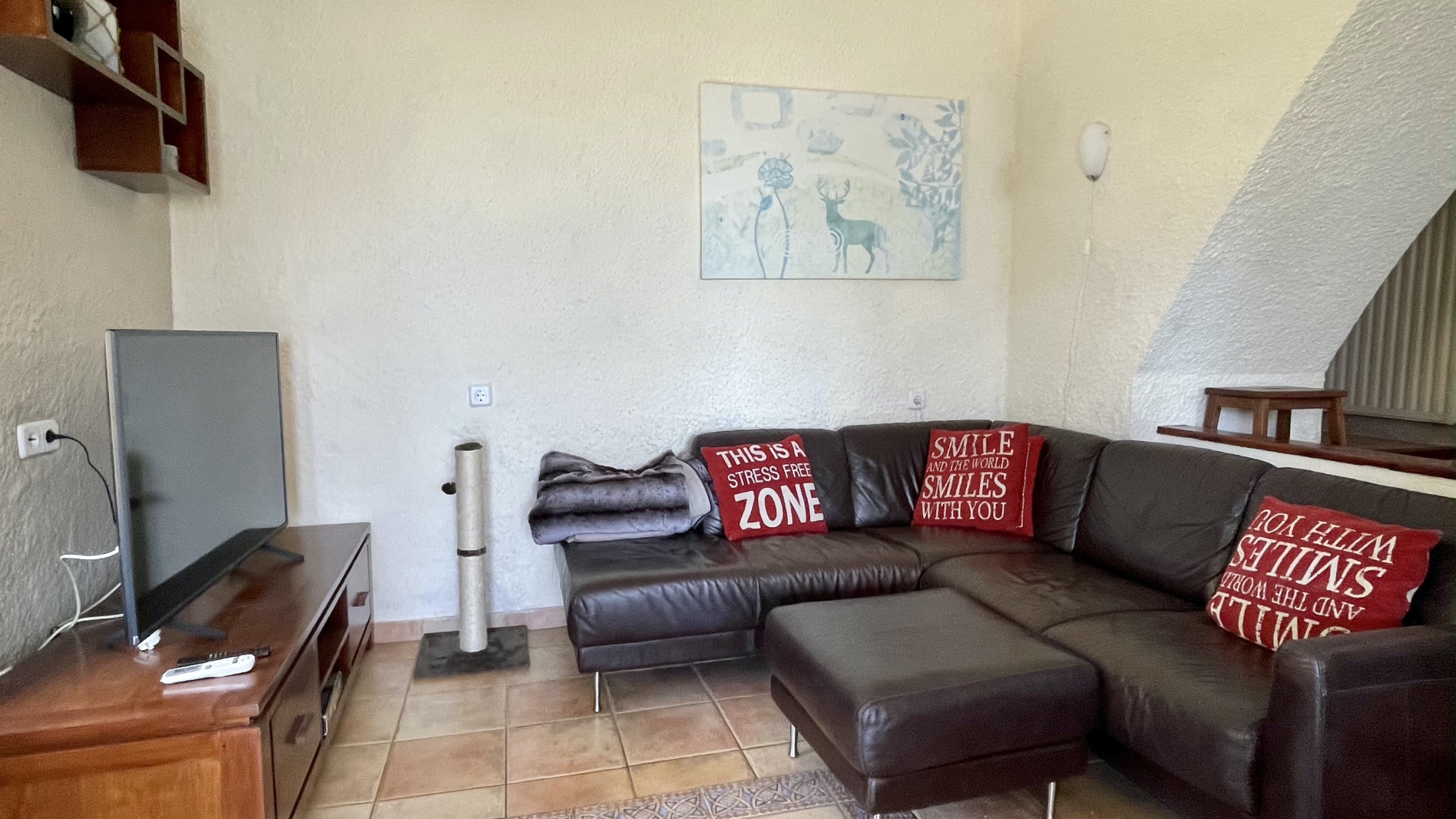 Op de bovenverdieping bevinden zich drie ruime en comfortabele slaapkamers en een complete badkamer. De benedenverdieping biedt een gezellige woonkamer met airconditioning, een extra toilet en een volledig uitgeruste aparte keuken. De keuken is voorzien van moderne apparatuur zoals een keramische kookplaat, koelkast, magnetron, oven, vriezer, vaatwasser, servies, bestek, keukengerei, koffiezetapparaat en broodrooster.