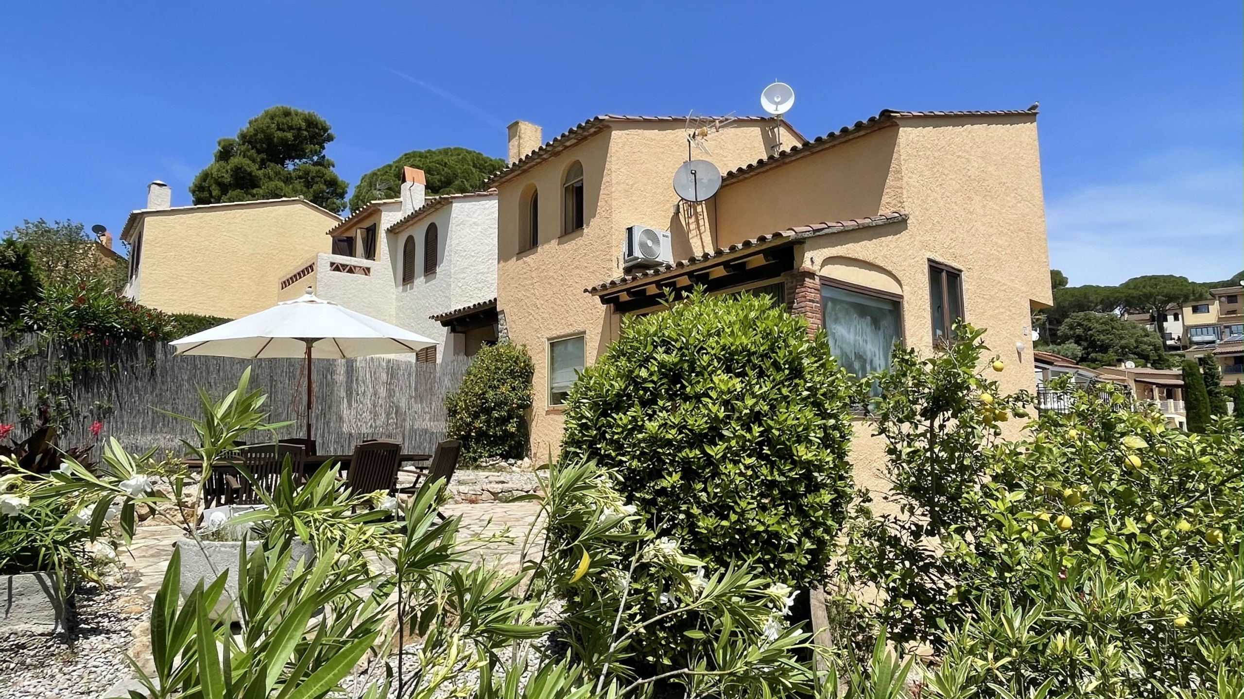 Buiten vindt u een groot terras, perfect voor dineren in de buitenlucht, een prachtige mediterrane tuin ideaal om te ontspannen, tuinmeubilair en een omheind perceel voor privacy en veiligheid. Er is ook een parkeerplaats op het terrein beschikbaar. Voor uw gemak is het huis uitgerust met een wasmachine, strijkijzer en een televisie.