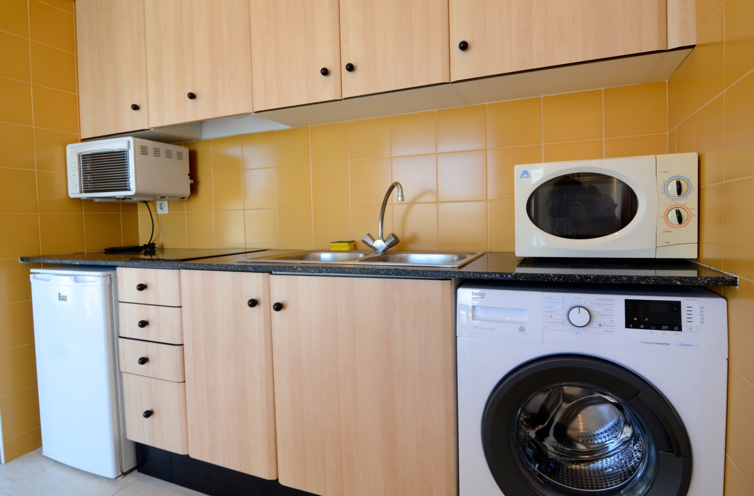 De open keuken, uitgerust met een keramische kookplaat, bevat een koelkast, magnetron, wasmachine, servies/bestek, keukengerei, koffiezetapparaat en broodrooster. Beddengoed is inbegrepen in de huurprijs en handdoeken kunnen aan je reservering worden toegevoegd tegen een extra kost van €5 per persoon.