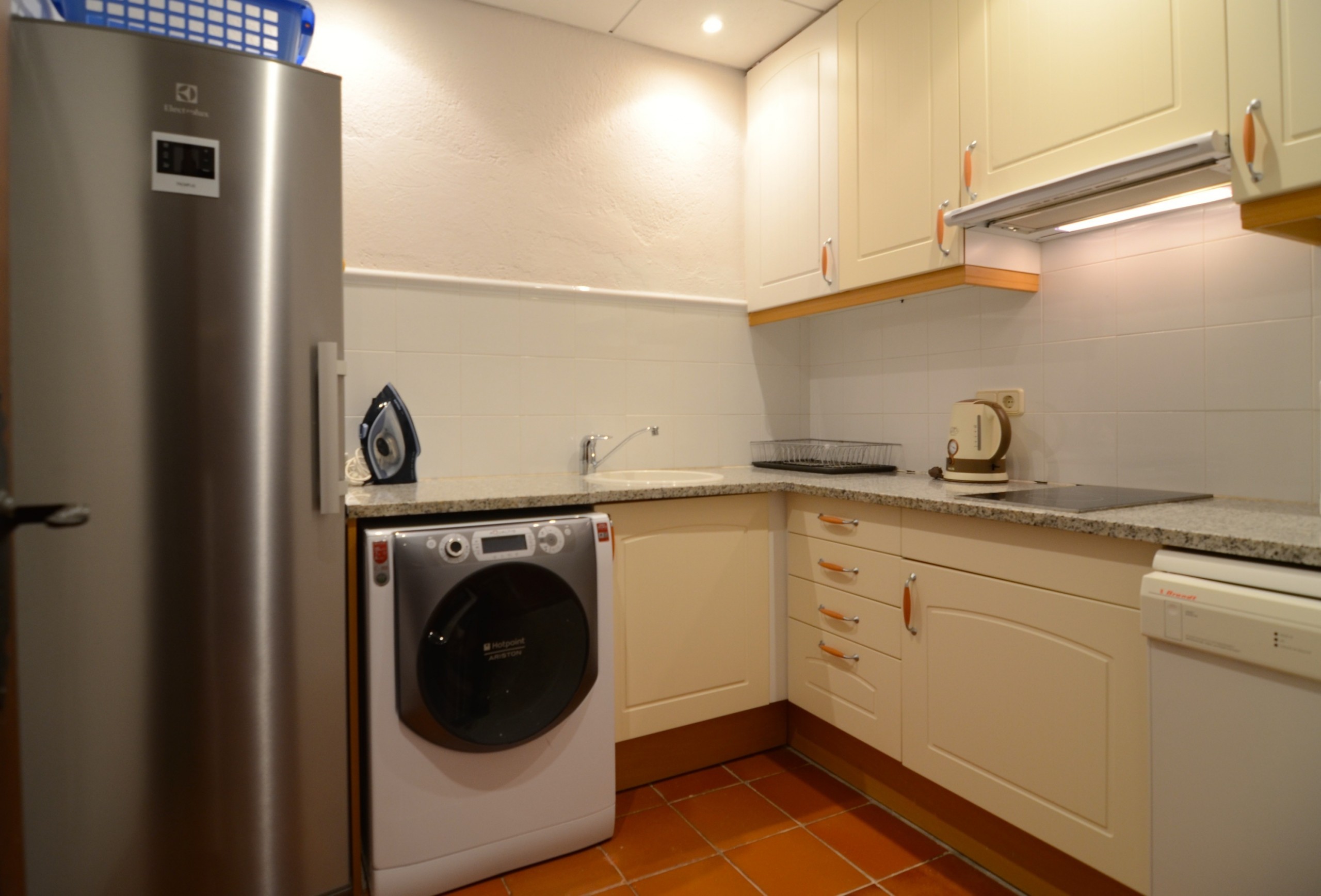 De aparte keuken, met keramisch fornuis, is uitgerust met koelkast, magnetron, oven, vriezer, wasmachine, droger, vaatwasmachine, servies/bestek, keukengerei, koffiezetapparaat, broodrooster, waterkoker en .