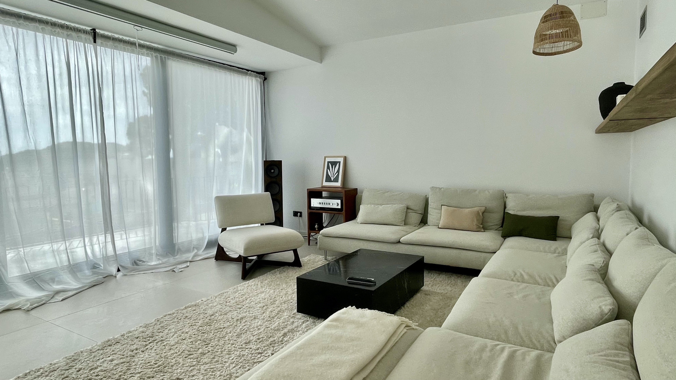 Ruime zaal met projector, surround sound en terras met uitzicht op zee