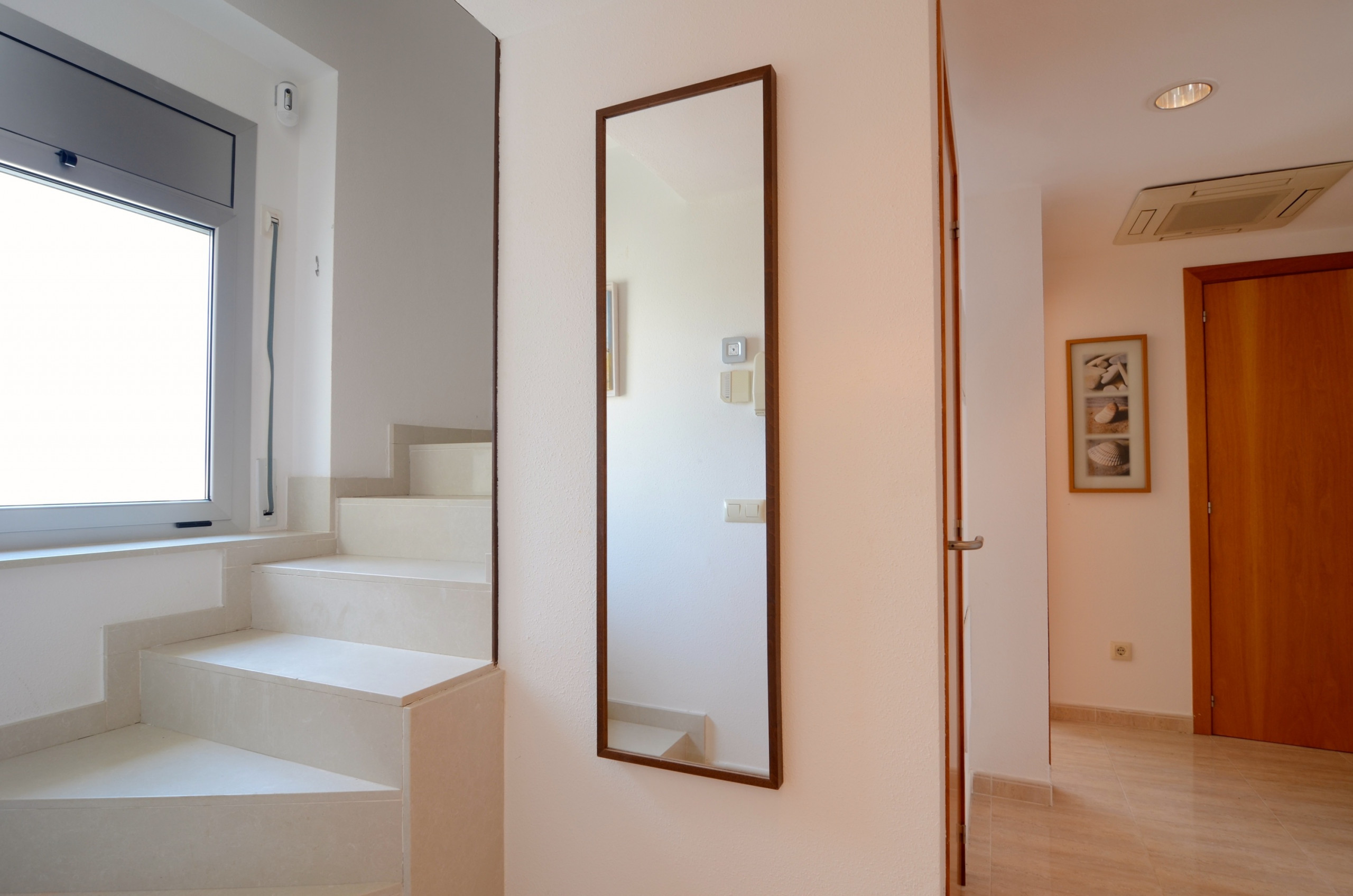 The duplex-style apartment is characterized by its excellent equipment and intelligent distribution. On the lower floor, there are three double bedrooms, one of them being a suite with a private terrace, as well as two full bathrooms. This layout provides comfort and privacy for guests.