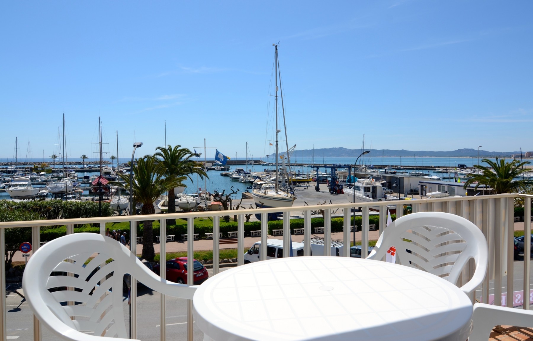 The 7 m² furnished terrace offers a view of the marina.