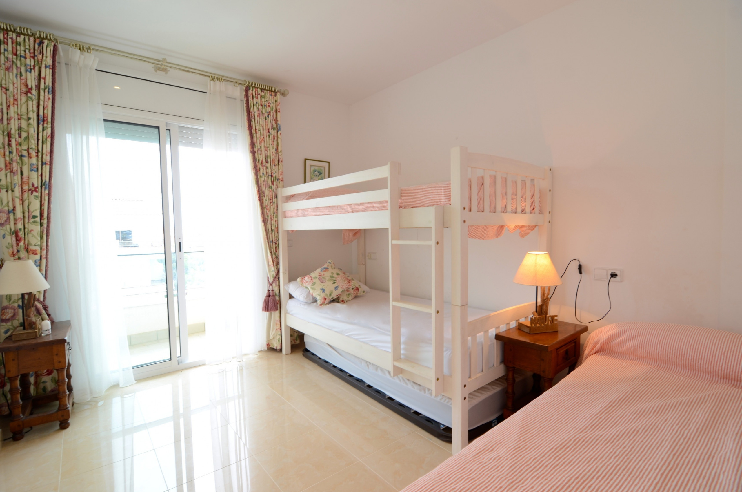 This lovely space includes a double bedroom and another with bunk beds, a well-appointed bathroom, an open kitchen connected to the living room, and a charming terrace. With the added convenience of a community pool and a parking space, you can relax and park your car with ease.