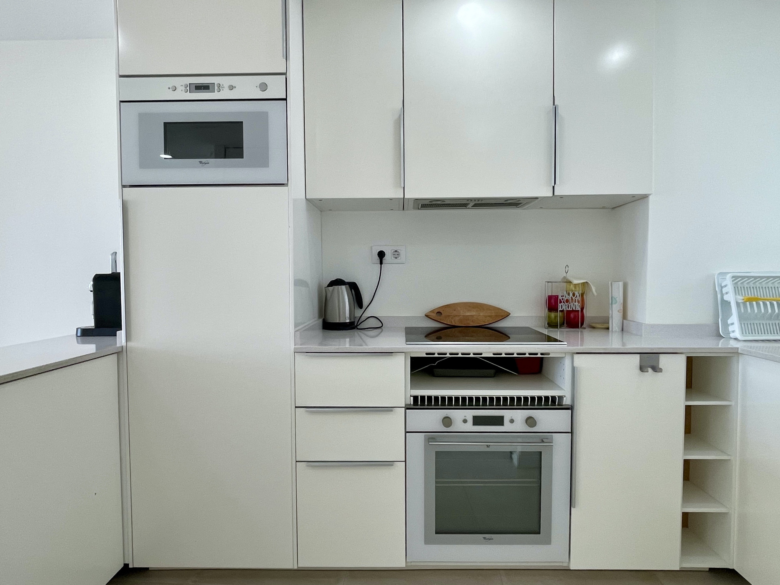 The open-plan vitroceramic kitchen is fully equipped with a refrigerator, microwave, oven, freezer, washing machine, dishwasher, as well as dishes, cutlery, kitchen utensils, a coffee machine, and a toaster.