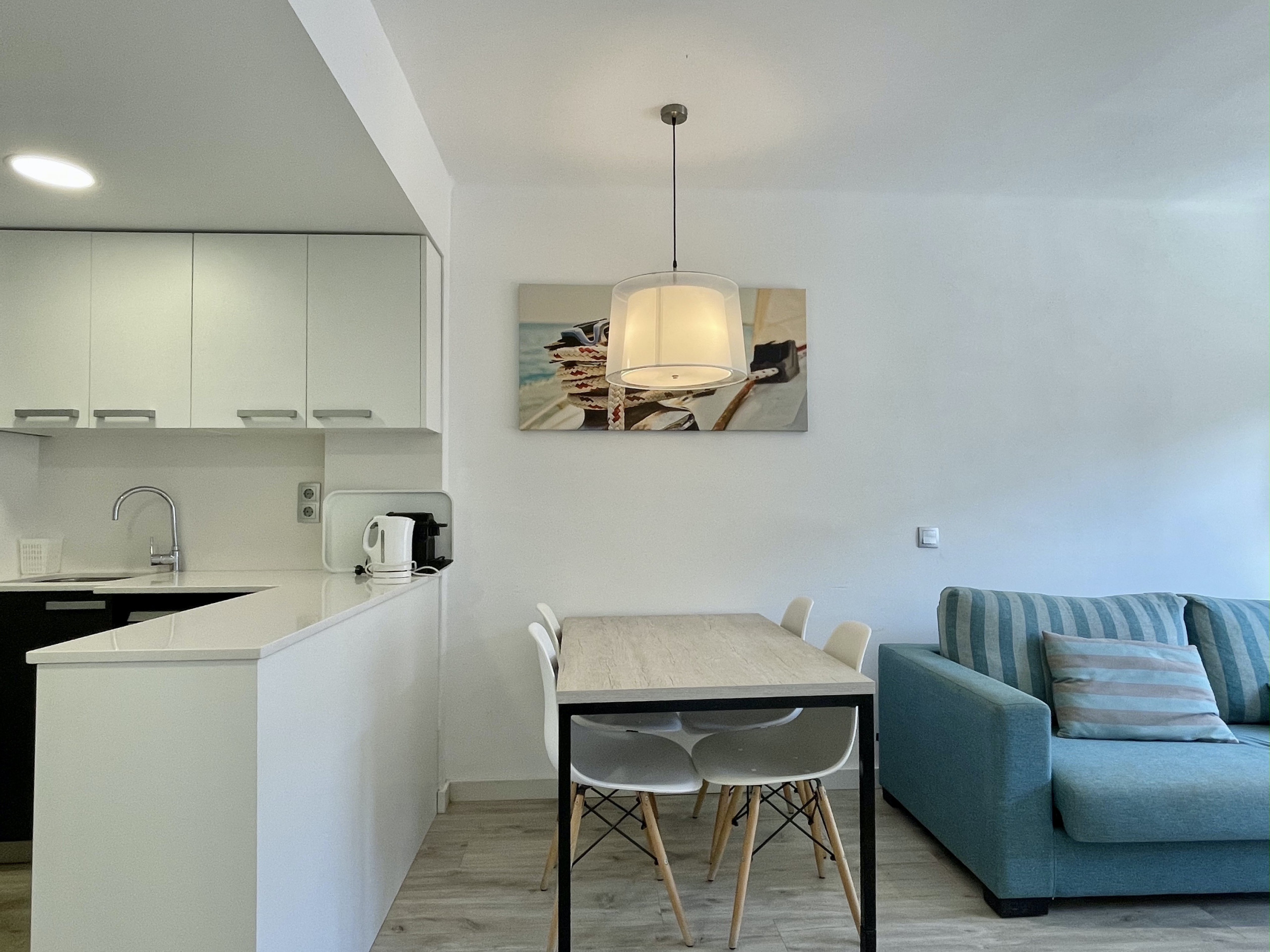 The open kitchen, equipped with a ceramic cooking system, is fully stocked with essential appliances such as a refrigerator, microwave, freezer, washing machine, dishwasher, as well as dishes, cutlery, cooking utensils, coffee maker, and toaster. Bed linens are included in the price, and towels can be added for 5€/person.
