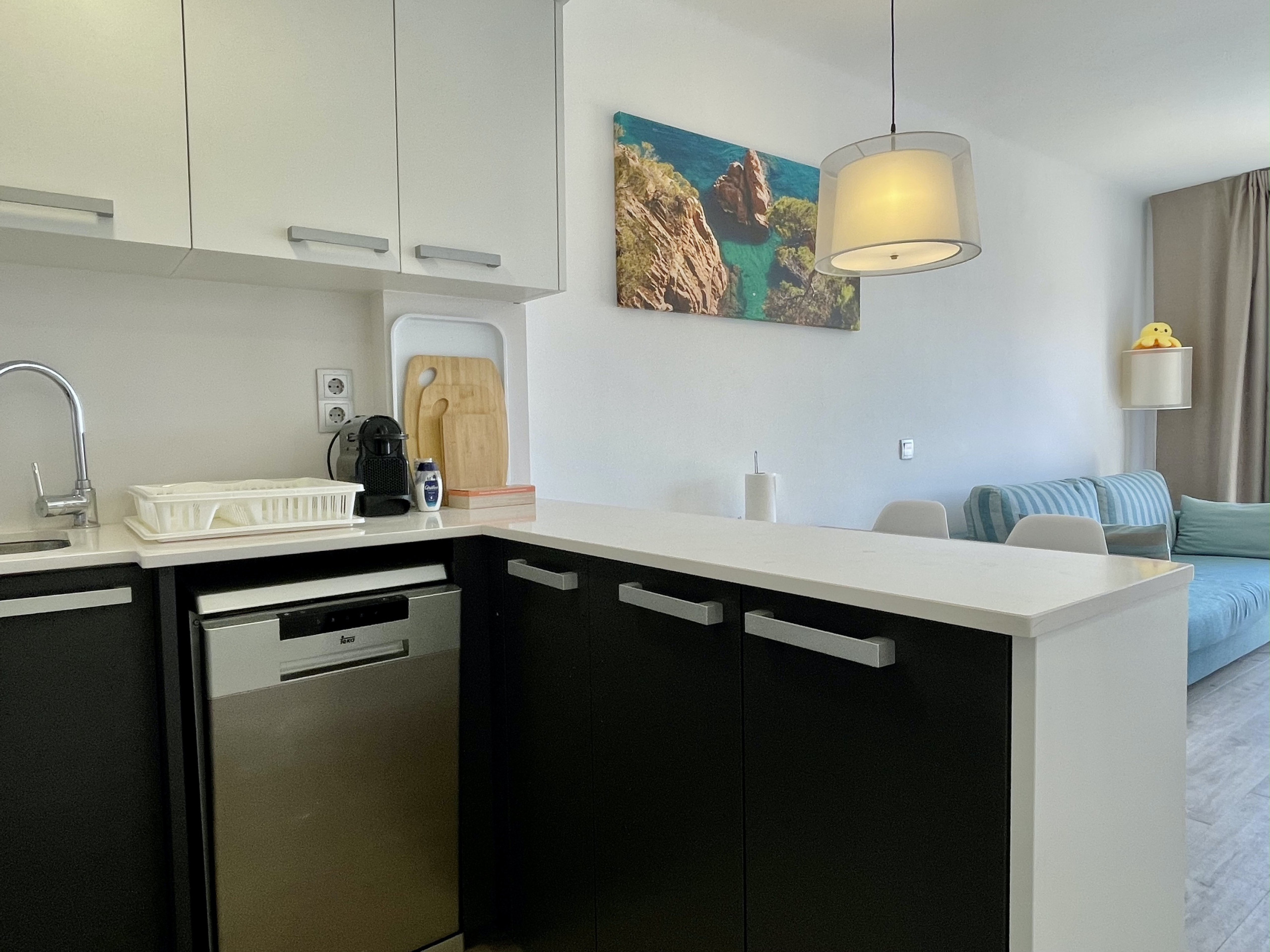 The open kitchen, equipped with a ceramic hob cooking system, is fully stocked with essential appliances such as a refrigerator, microwave, freezer, washing machine, dishwasher, as well as tableware, cutlery, kitchen utensils, coffee maker, and toaster. Bed linens are included in the price, and towels can be added for 5€/person.