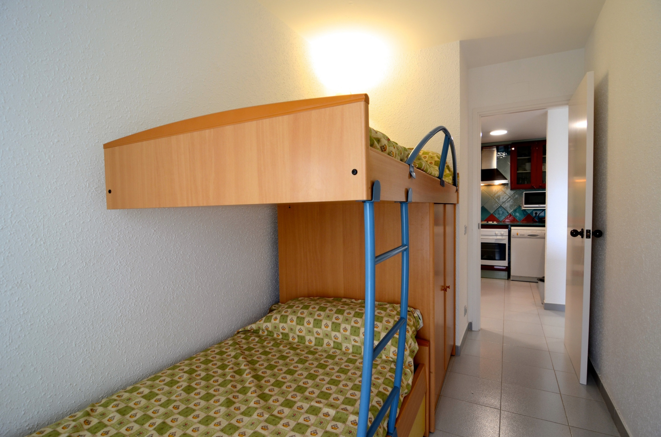 In the Rocamaura complex, this 1-bedroom apartment is available for vacation rental, featuring a double bunk bed and a single bed, accommodating up to 3 people. It includes a living-dining room with a sofa and TV, a small independent kitchen, and a bathroom with a shower.