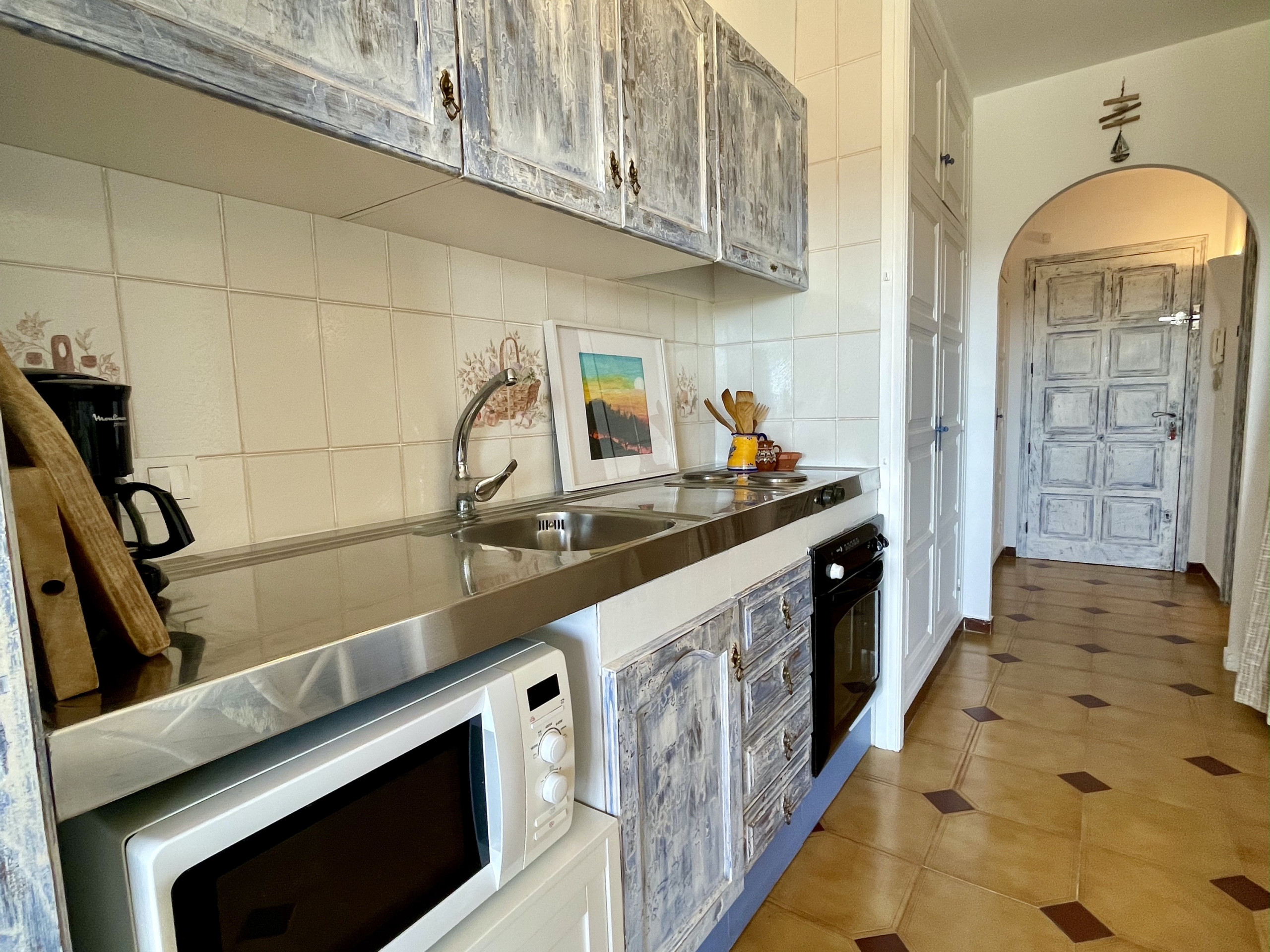 The accommodation is well-equipped for a delightful stay, offering a lift for easy access, an iron for your convenience, and air conditioning (heat pump) in the living room to keep you comfortable. The communal+children's swimming pool is ideal for refreshing dips, and entertainment options include a TV.