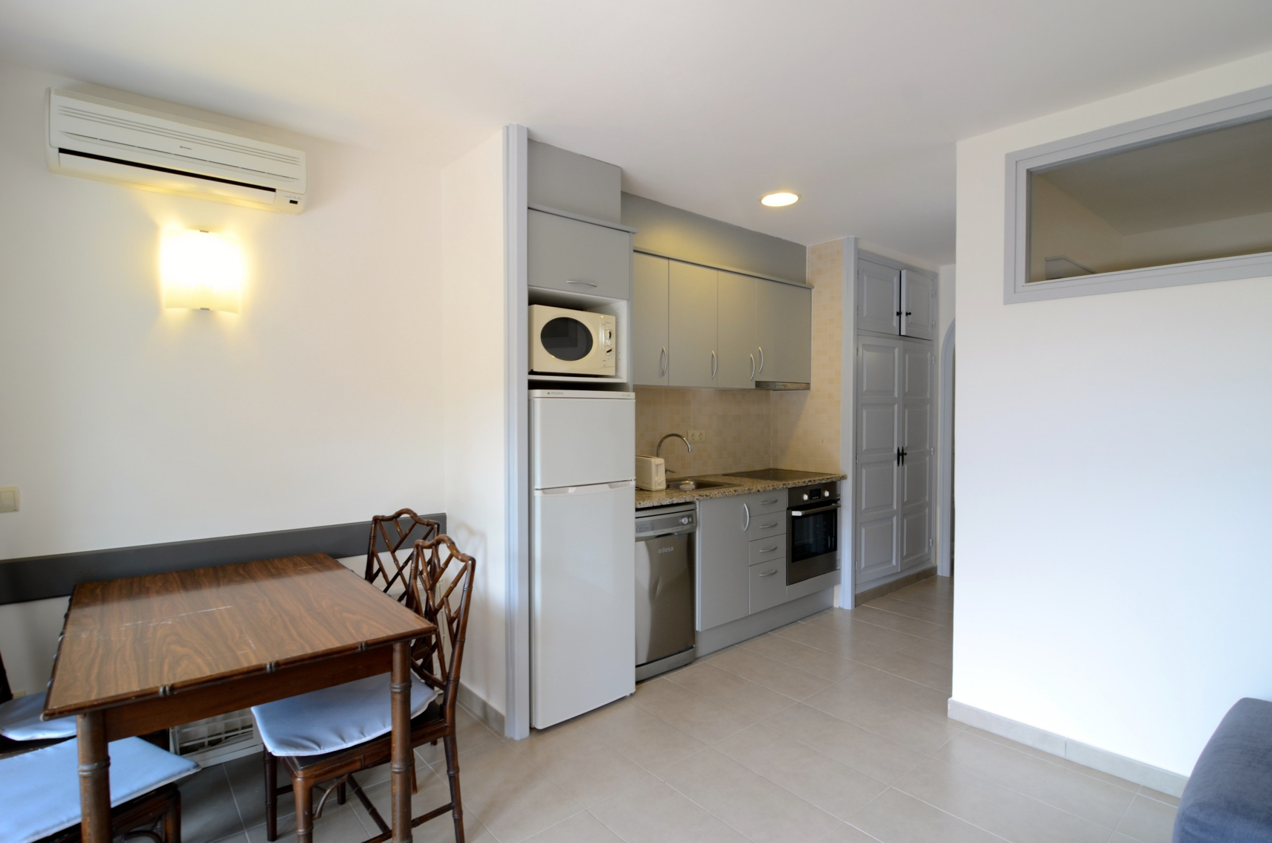 In the Rocamaura complex, this 1-bedroom apartment is available for vacation rental, featuring a double bunk bed and a single bed, accommodating up to 3 people. It includes a living-dining room with a sofa and TV, a small independent kitchen, and a bathroom with a shower.