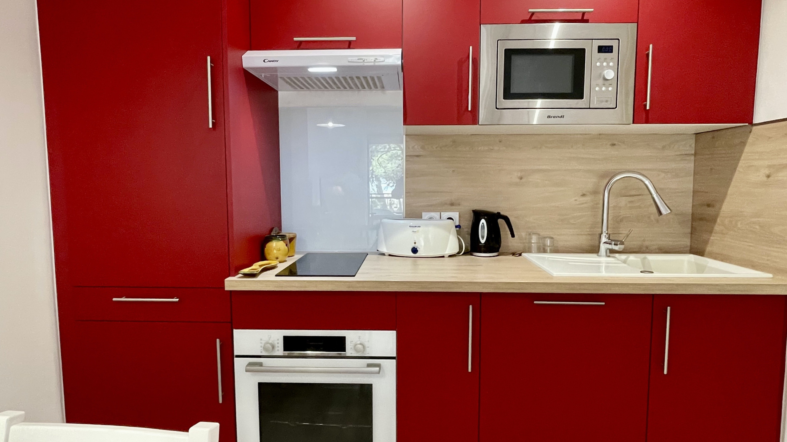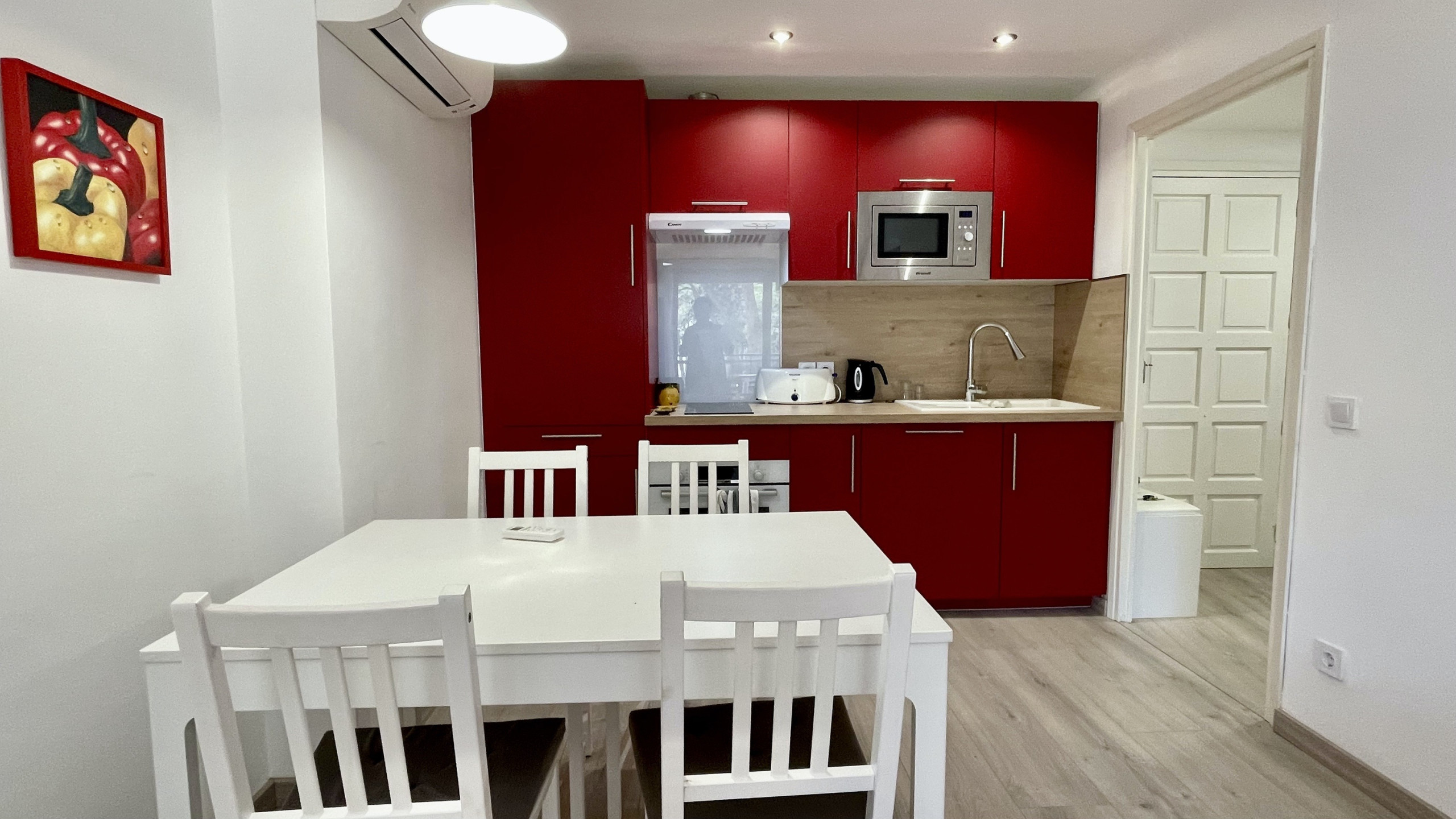 The apartment has two bedrooms that can comfortably accommodate up to 4 people, with a layout of 2 single beds and 2 bunk beds. The living area includes air conditioning to maintain a cool environment during the hottest days, and a fully equipped American kitchen with modern appliances such as a refrigerator, washing machine, oven, microwave, coffee maker, and toaster.