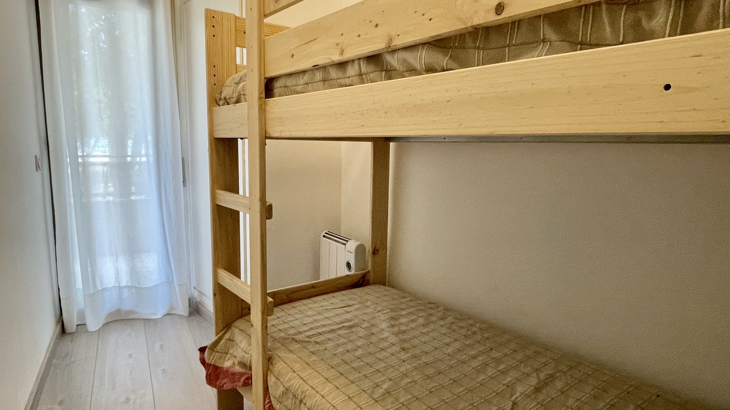 In the Rocamaura complex, this 1-bedroom apartment is available for vacation rental, featuring a double bunk bed and a single bed, accommodating up to 3 people. It includes a living-dining room with a sofa and TV, a small independent kitchen, and a bathroom with a shower.