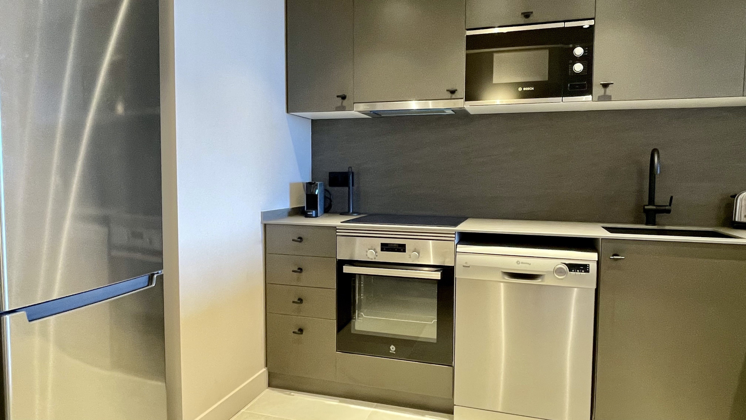 The open kitchen, with induction appliances, meets the highest expectations. Fridge, microwave, oven, freezer, washing machine, dishwasher, dinnerware, cutlery, kitchen utensils, coffee maker, toaster, and kettle: everything you need to prepare delicious meals or enjoy a morning cup of coffee.