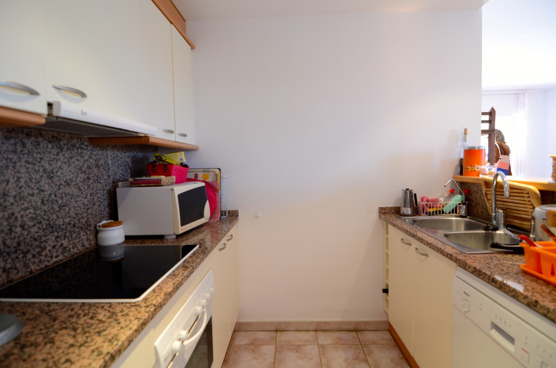 In the vitroceramic open plan kitchen, refrigerator, microwave, washing machine, dishes/cutlery, kitchen utensils, coffee machine and toaster are provided.