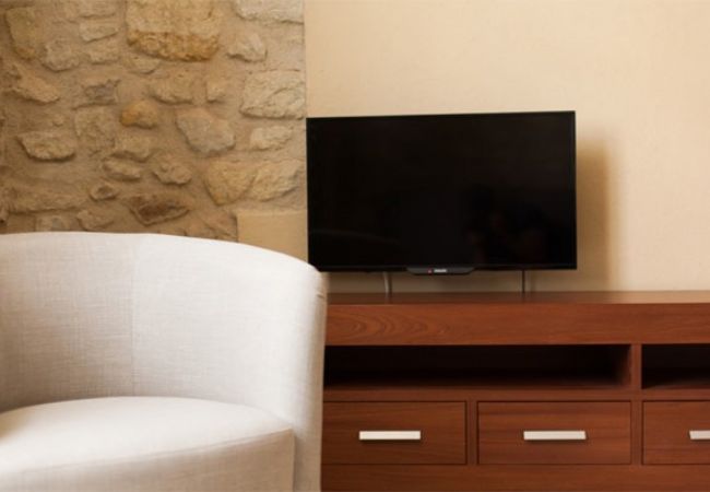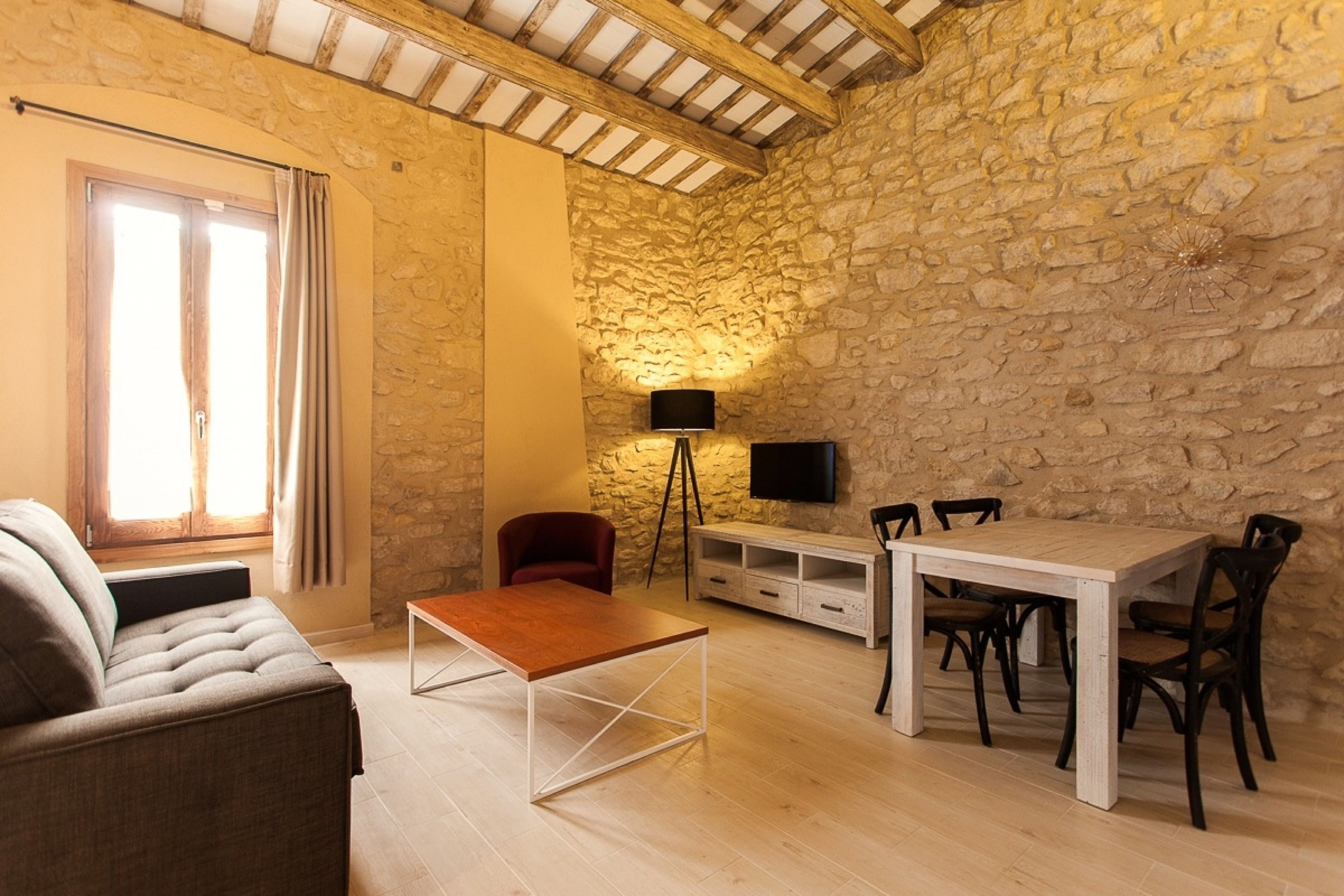 The Petit Pals property is an inviting complex of 5 different-sized apartments and one guestroom, with attractive stone features on some walls, wooden beams on some ceilings, etc.