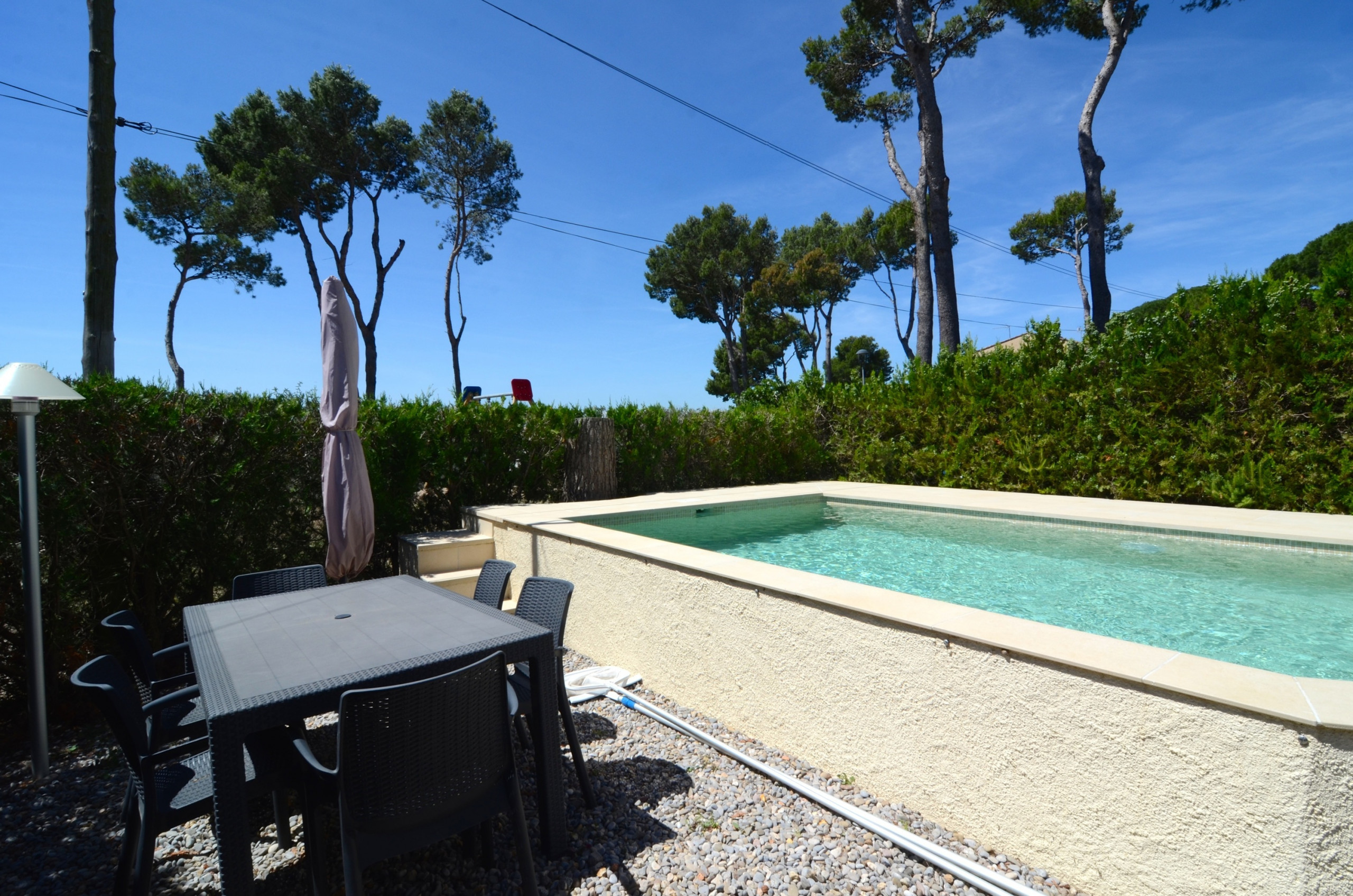 Your accommodation includes a fenced garden, a 6 m² terrace with chairs and a table, an iron, a balcony, air conditioning in the living room, a private pool, outdoor parking within the premises, and a television for your entertainment. If needed, the agency could provide internet access (subject to availability, €10/day).