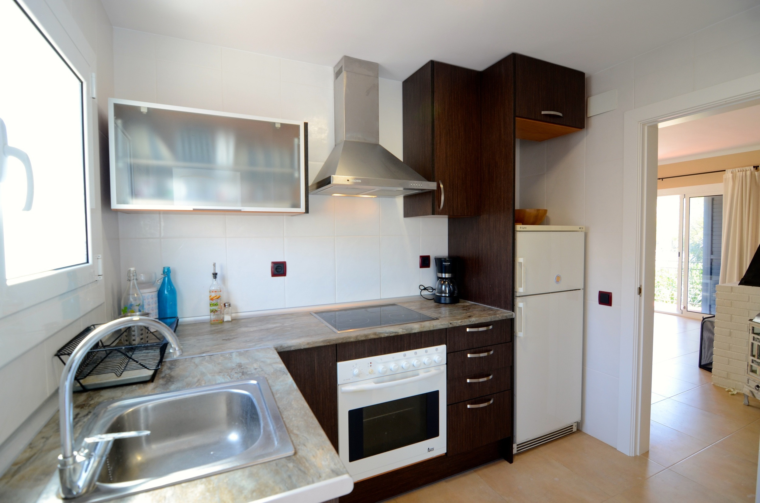 The open-plan kitchen, renovated in 2023, is fully equipped with a refrigerator, microwave, oven, freezer, dishes/cutlery, kitchen utensils, coffee maker, and toaster, allowing you to prepare your own meals if desired.